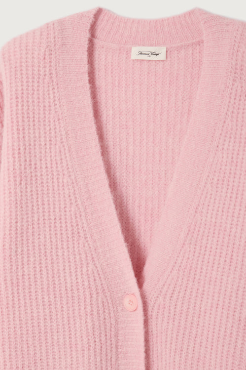 Blød og feminin cardigan i en smuk meleret lyserød nuance. Designet har en klassisk V-udskæring, knaplukning foran og lange ærmer, der giver et afslappet og komfortabelt look. Den lette strikkvalitet gør den perfekt som lag-på-lag – både over kjoler, skjorter og simple toppe. En alsidig favorit fra American Vintage, der tilfører varme og et strejf af farve til garderoben året rundt.