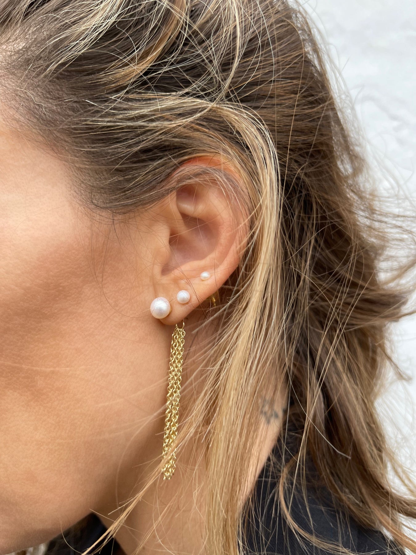 Charlotte Pearl chain-øreringe fra Andcopenhagen kombinerer perler med kædedetaljer i et tætsiddende design. De sidder tæt på øret og er nemme at style til både hverdag og fest. Undgå kontakt med fugt for at bevare finishen.