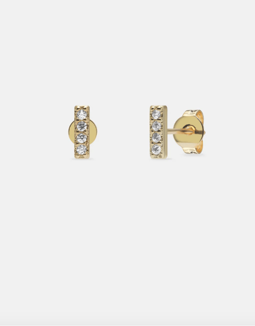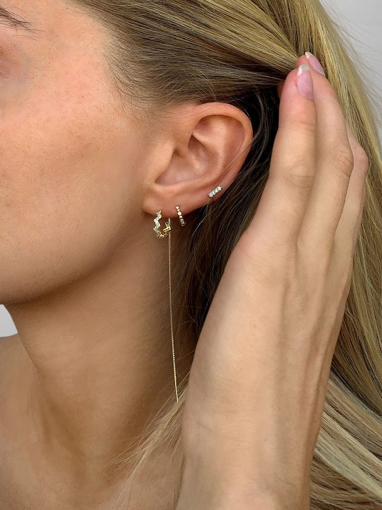 Line ørestikker fra Andcopenhagen kombinerer 18 karat guldbelagt sterlingsølv med fire zirkonia-sten i en diskret størrelse på 1,5 x 5 mm. Ørestikkerne kan bæres alene eller sammen med andre smykker.