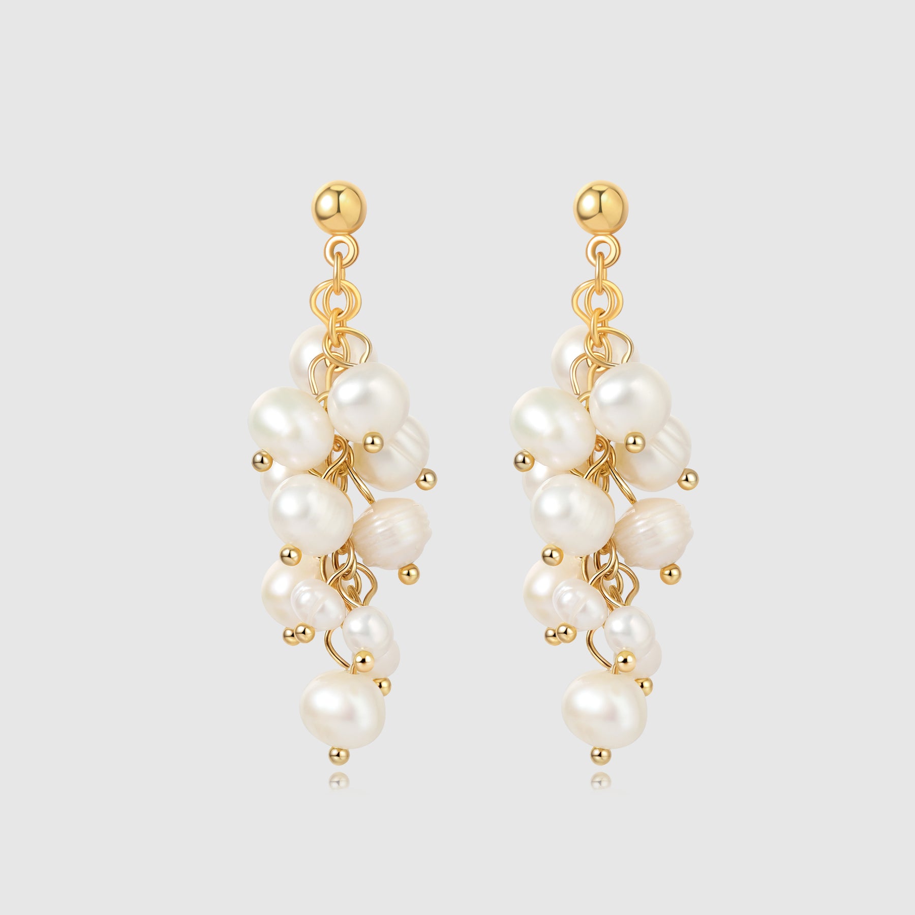 Andcopenhagen Polly øreringe med fem ægte ferskvandsperler i dynamisk klyngeformation. Perlernes naturlige glans fanger lyset og skaber bevægelse, når du bærer dem til festlige lejligheder.