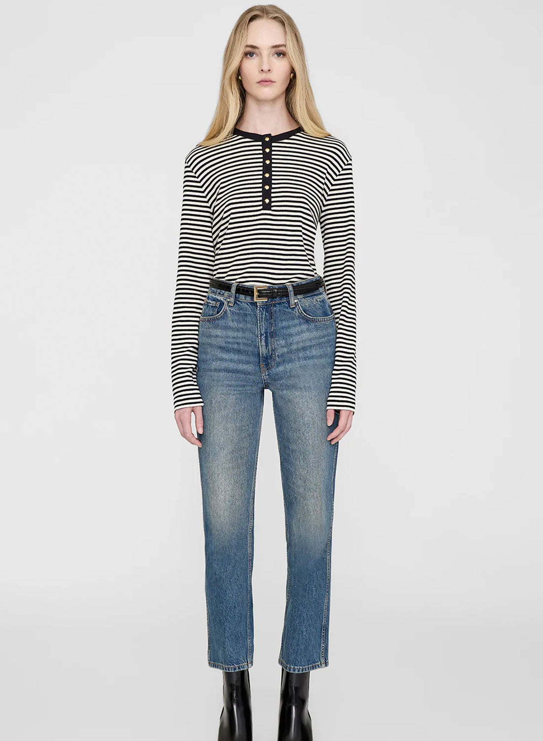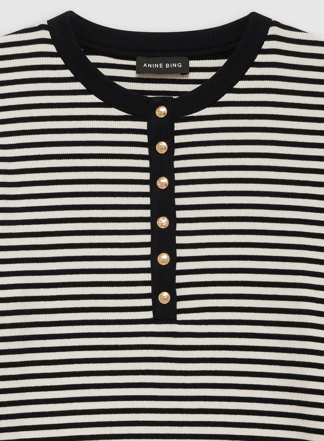 Anine Bing Alessia Long Sleeve Tee er en langærmet t-shirt med en høj halsudskæring og guldmonogram trykknapper langs frontstolpen. Den er lavet i en tæt bomuld-spandex blanding med ribbet tekstur, hvilket giver en behagelig og fleksibel pasform. T-shirten har et afslappet snit og kommer i klassiske sorte og hvide striber – et stilrent basic item til garderoben.