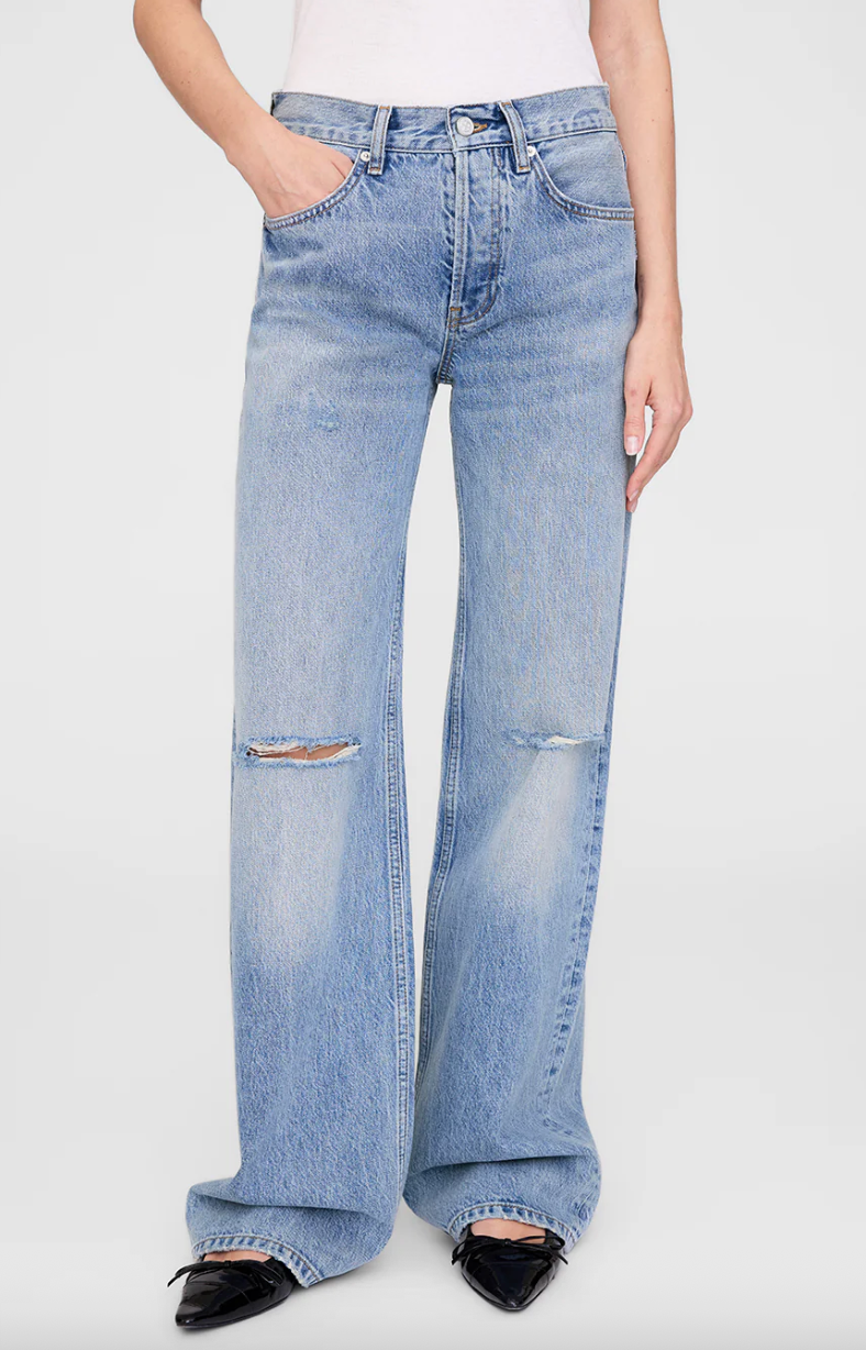 Jeansene har en afslappet pasform med slidte detaljer ved knæene, mellemhøj talje designet til at sidde lavt på hofterne, knaplukning, vide ben og lange benlængder. Afsluttes med en rå, ubehandlet sømkant