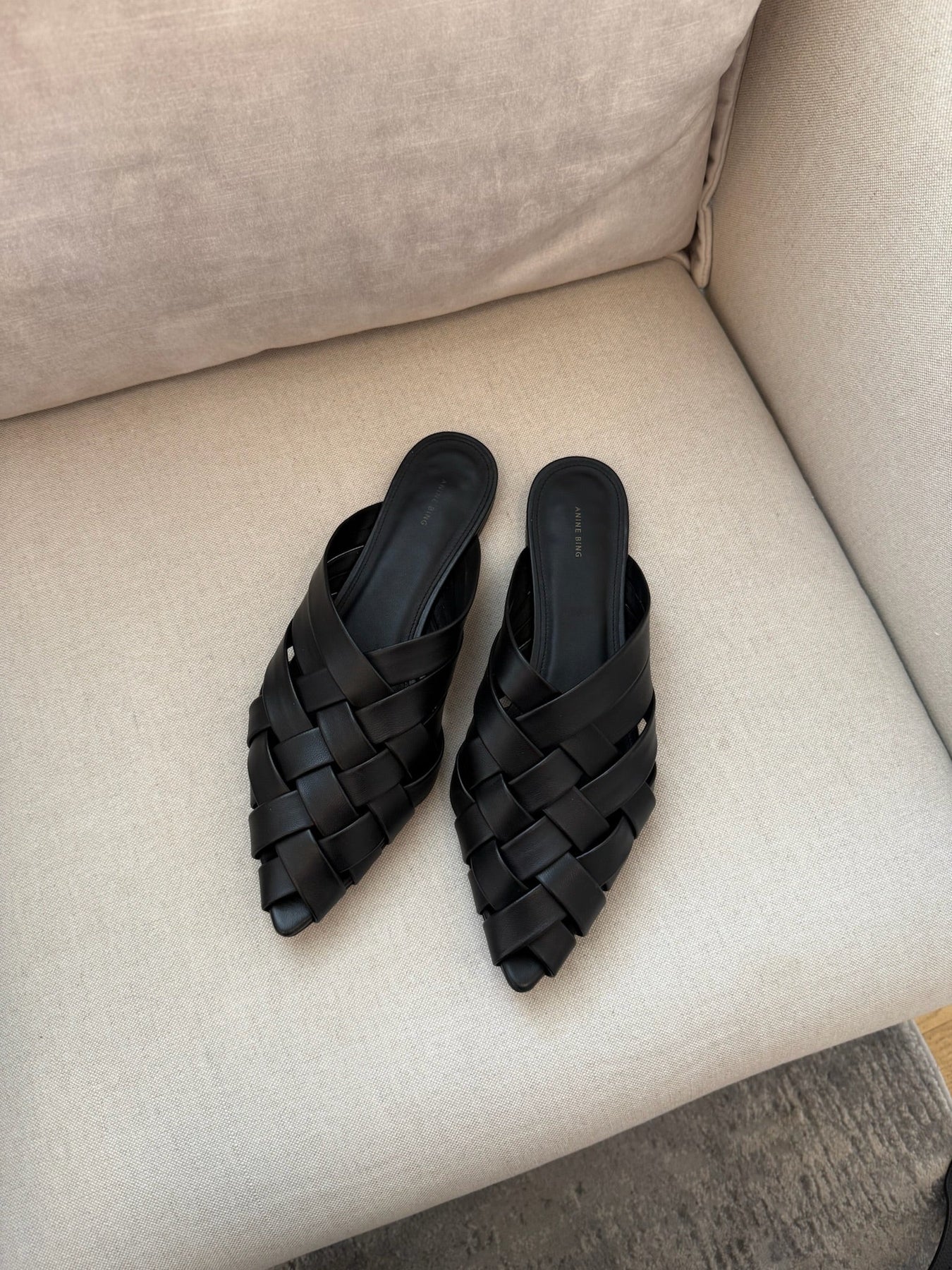 En flettet slip-on sandal med flade remme, fremstillet af glat 100% sort læder. Designet har en diskret spids snude og bløde, polstrede remme, der giver både stil og komfort. Indersålen er let polstret for ekstra støtte, mens ydersålen i højglanslæder tilføjer et elegant touch. Sandalen fuldendes med guldfarvet monogramdetalje som en raffineret finish.