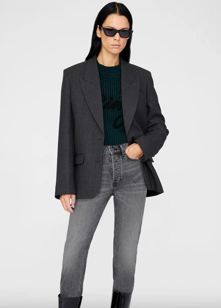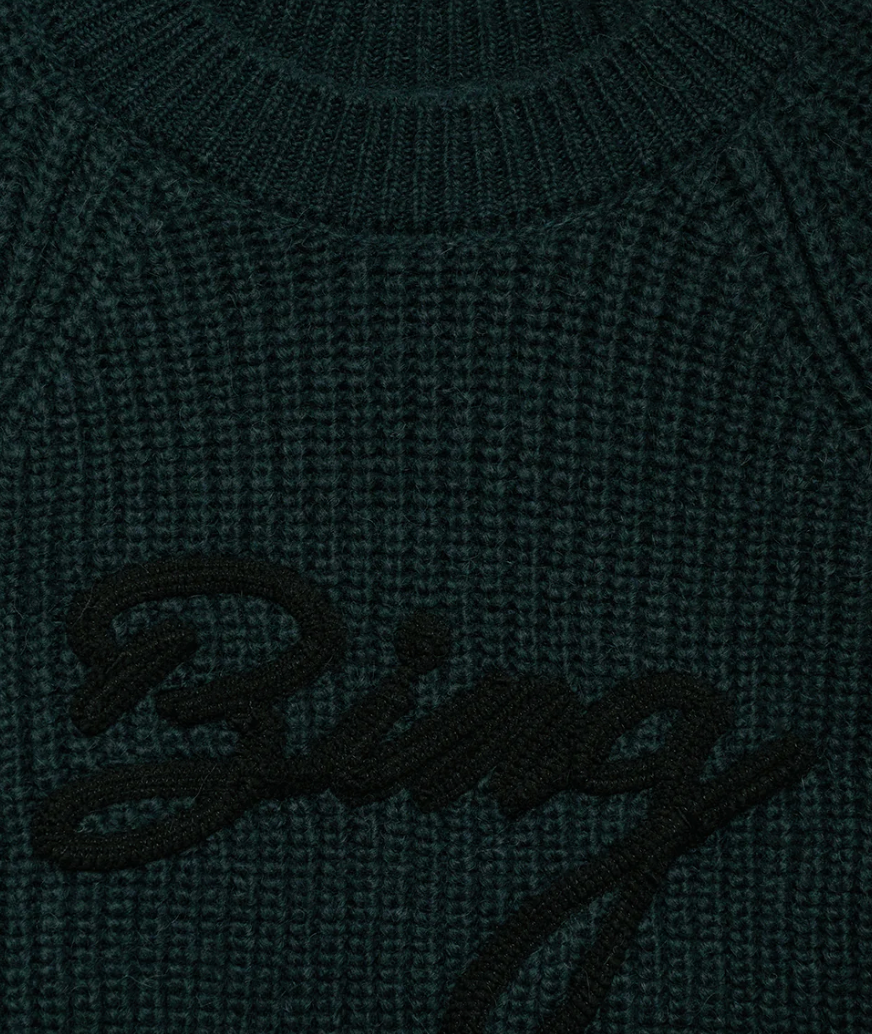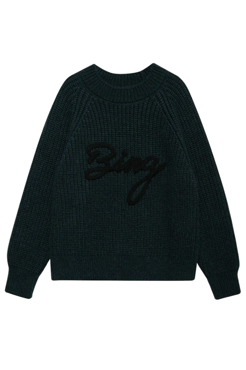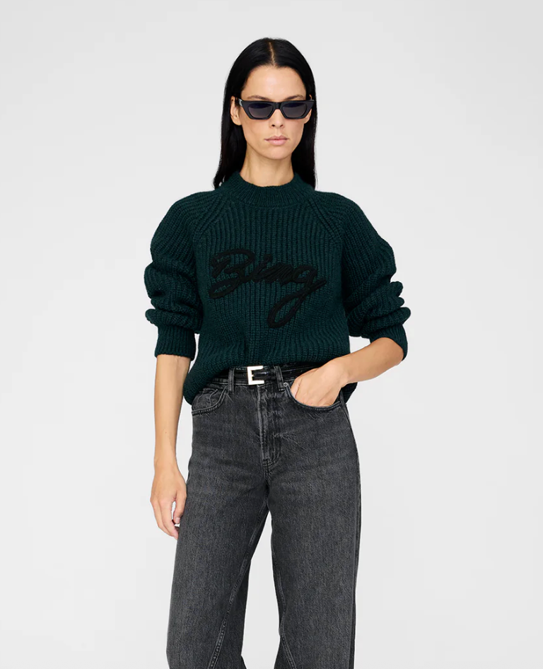 Kendrick-sweateren fra Anine Bing kombinerer en blød alpaka-uldblanding med et markant design. Den mørke teal-farve og det karakteristiske Bing-logo på fronten giver dig et tidssvarende udtryk til din garderobe.