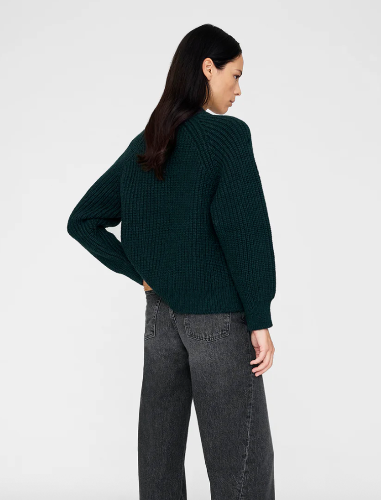 Sweateren er nem at style med både jeans og nederdele. Den bløde alpaka-uldblanding holder dig varm uden at føles tung, og den mørke teal-farve passer til både neutrale og farverige outfits.