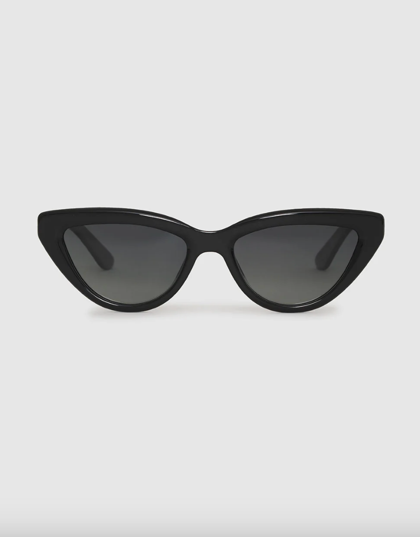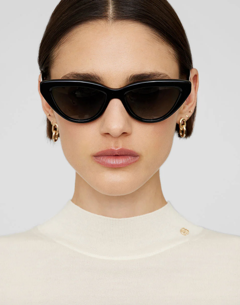 Sedona Solbrillerne er et universelt flatterende, vintage-inspireret par med en elegant katteøje-form, sorte acetatstel og matchende sorte linser. De er accentueret med et guldfarvet ANINE BING monogram på hver stang. Polariseret med UV400 beskyttelse.