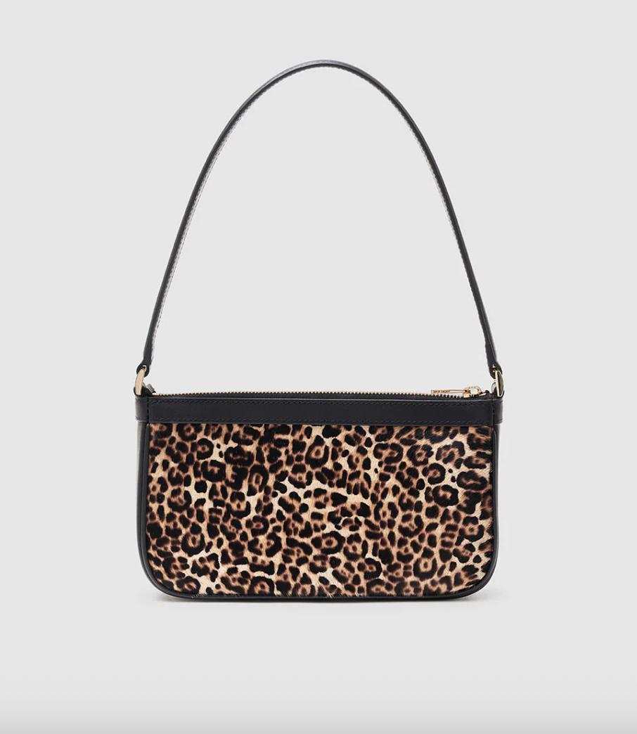 Mini Elly-tasken kombinerer 100% kalvelæder med et karakteristisk leopardmønster. Den kompakte størrelse på 22,5 x 12,7 x 3,9 cm gør den ideel til dine hverdagsessentials, mens gulddetaljerne tilfører et raffineret touch.