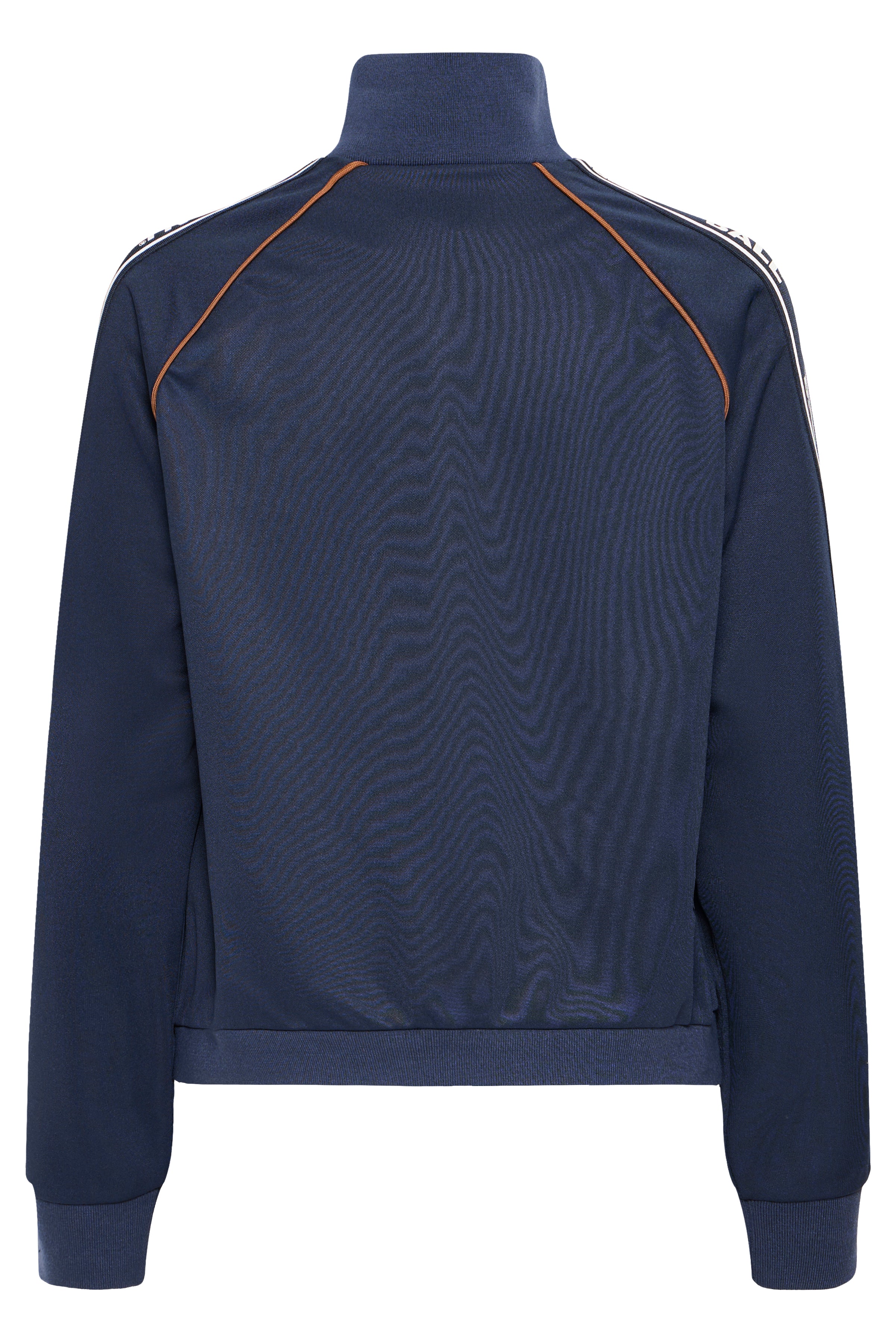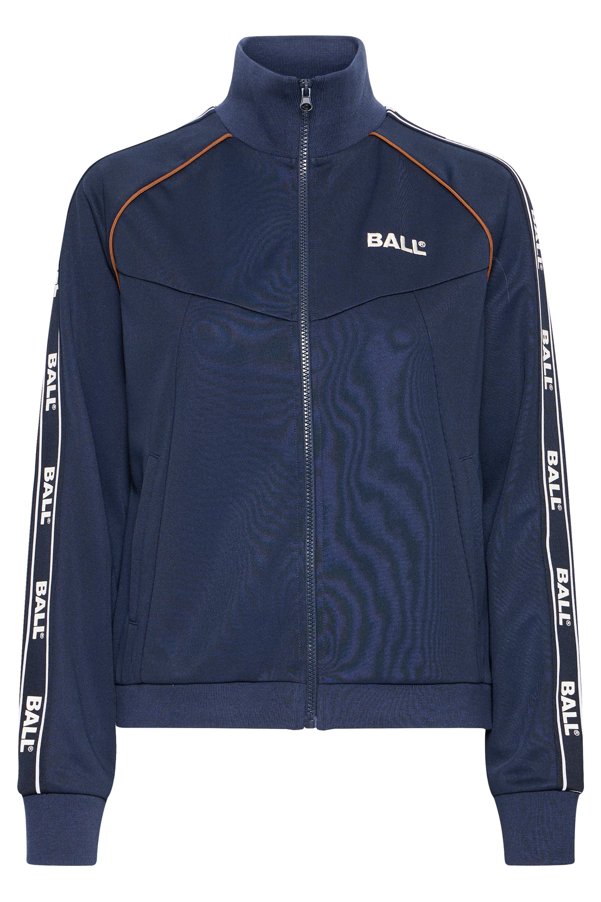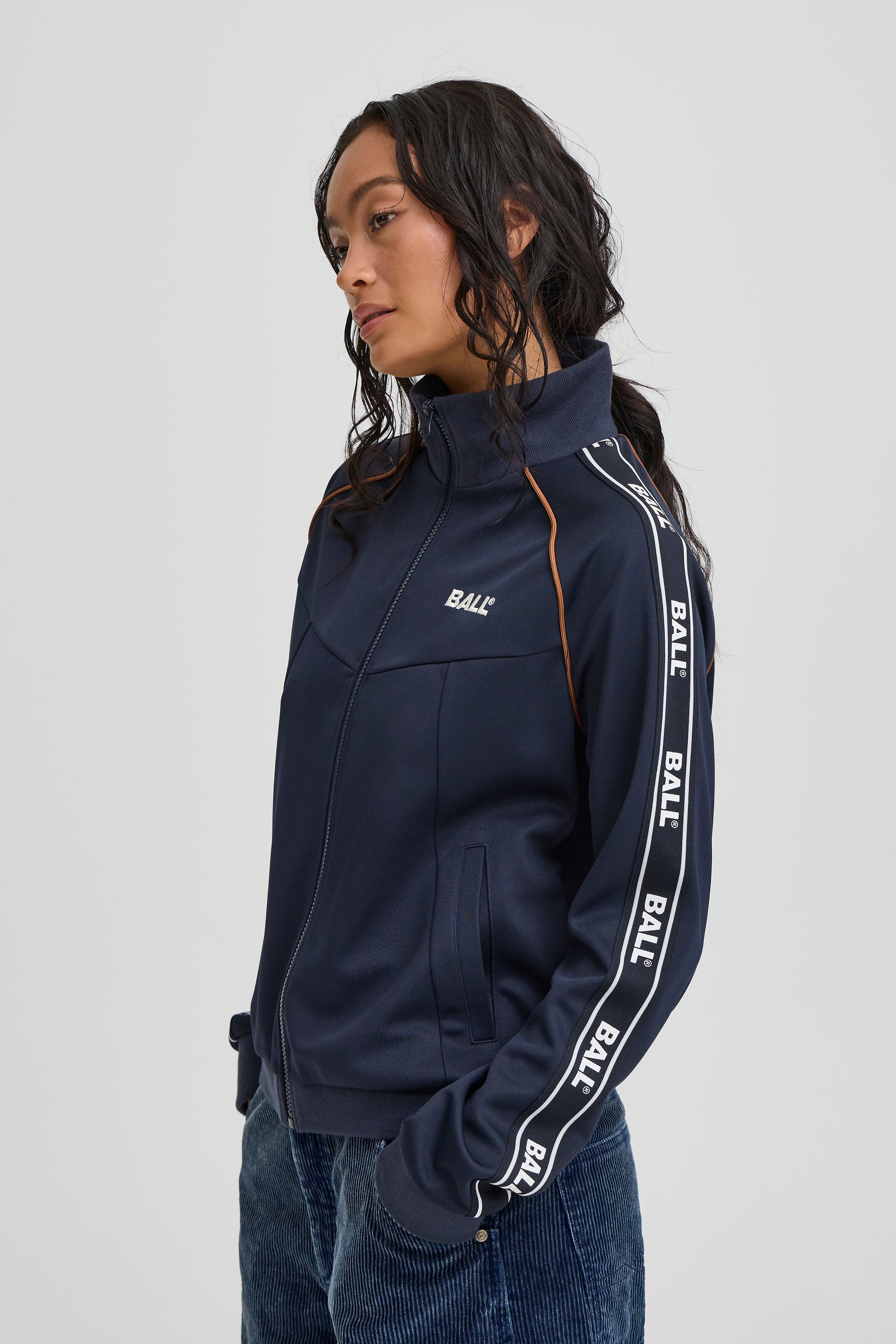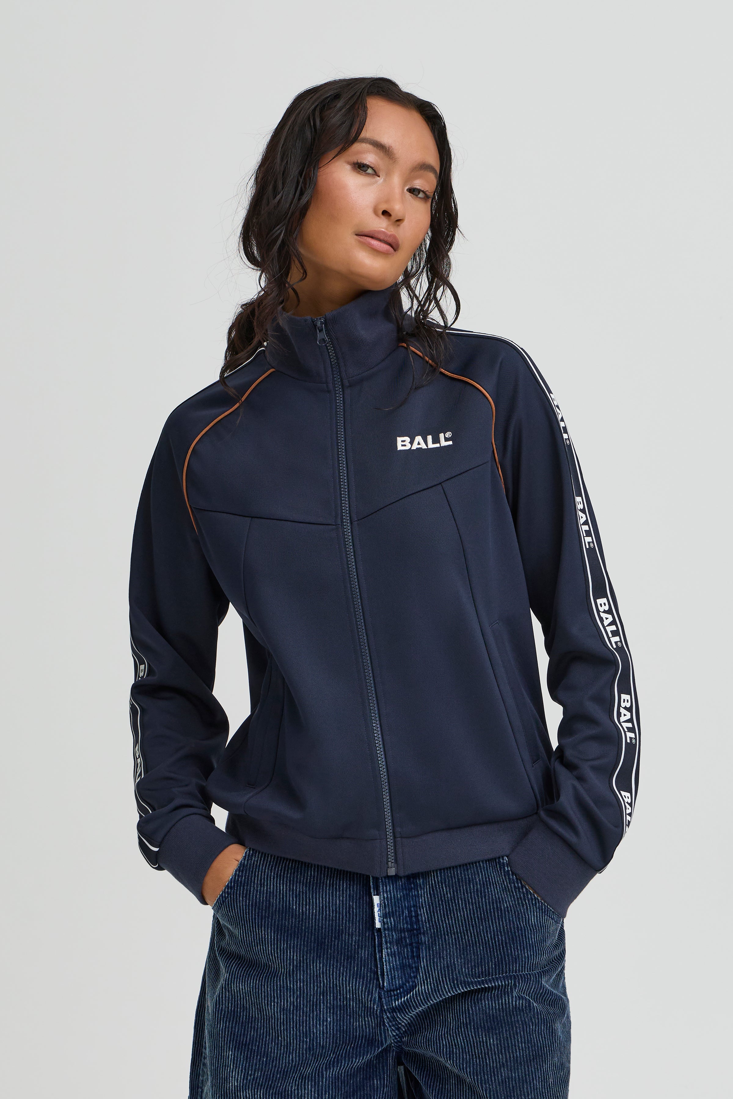 Den blå Ball Nicolina Track Jakke bringer et sporty, retro-inspireret look ind i hverdagsgarderoben. Jakken har en praktisk lynlås, høj krave og sidelommer, mens de kontrastfarvede striber på ærmerne og det diskrete brystlogo giver et klassisk track-præg. Lavet i let polyester med en normal pasform, er den ideel til både jeans, træningsbukser eller casual outfits.