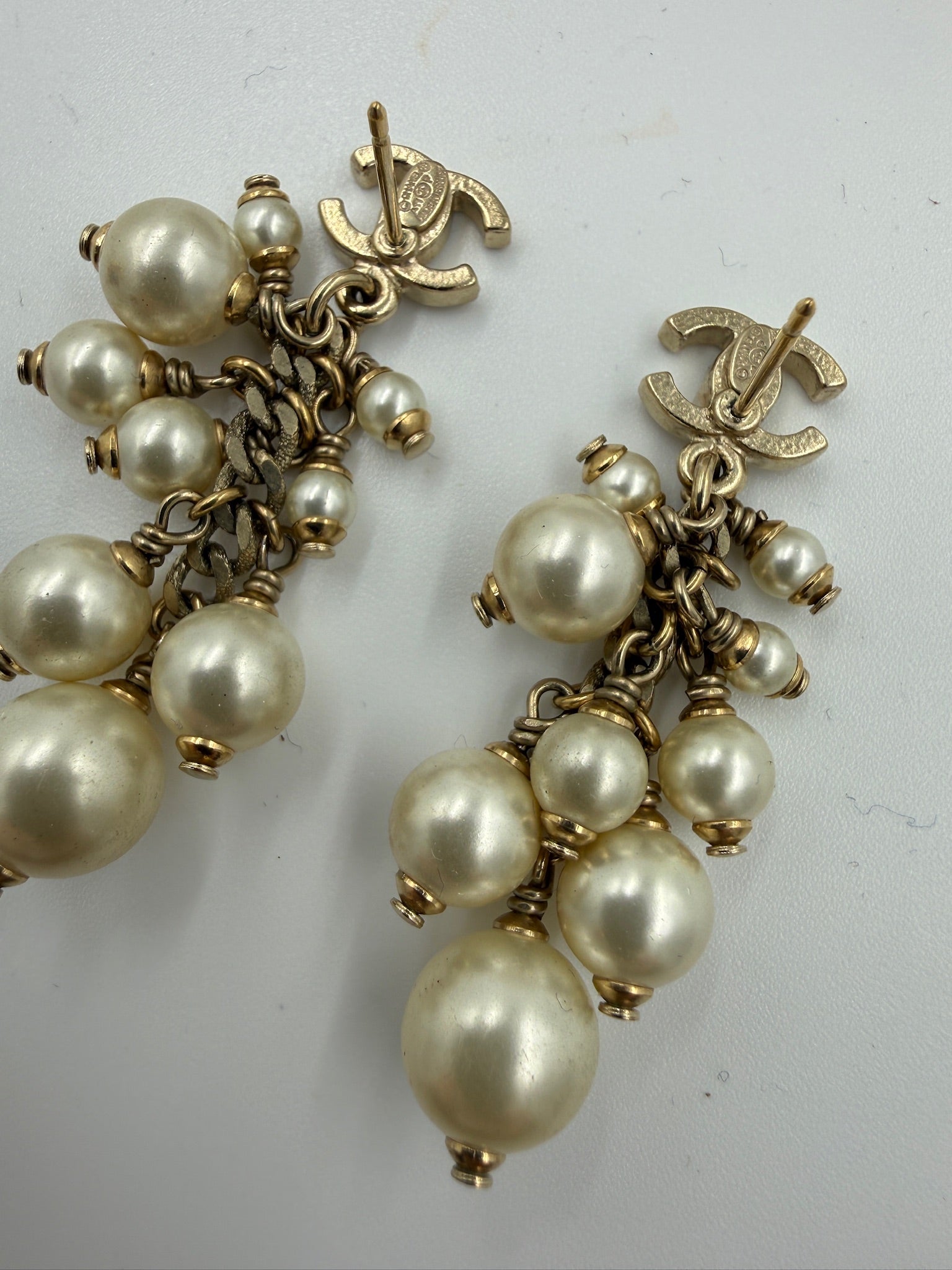 Elegante Chanel øreringe i klassisk, tidløst design. Øreringene er udført med det ikoniske CC-logo i guldfarvet metal, hvorfra der hænger et dekorativt bundt af imiterede perler i forskellige størrelser. Perlerne er monteret på fine kædeled og bevæger sig smukt, hvilket giver øreringene et levende og luksuriøst udtryk.