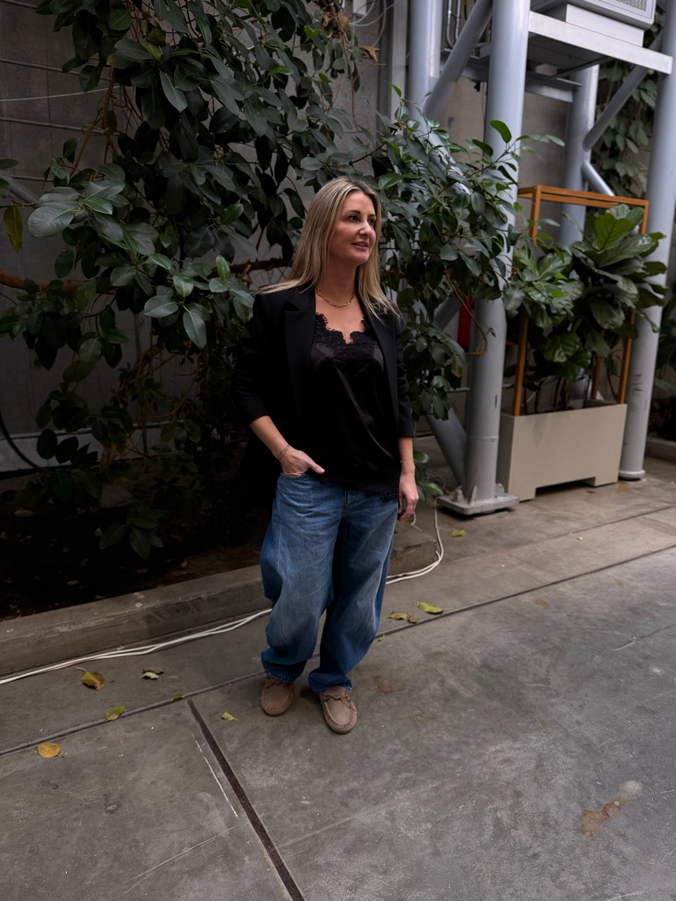 De delikate blondekanter ved udskæring og kant understreger det luksuriøse udtryk, mens de fine spaghetti-stropper skaber et stilrent og moderne look. Toppen fungerer perfekt både til hverdag og fest – style den med jeans for et afslappet, men chic outfit, eller kombiner den med en nederdel og blazer for et mere sofistikeret udtryk.