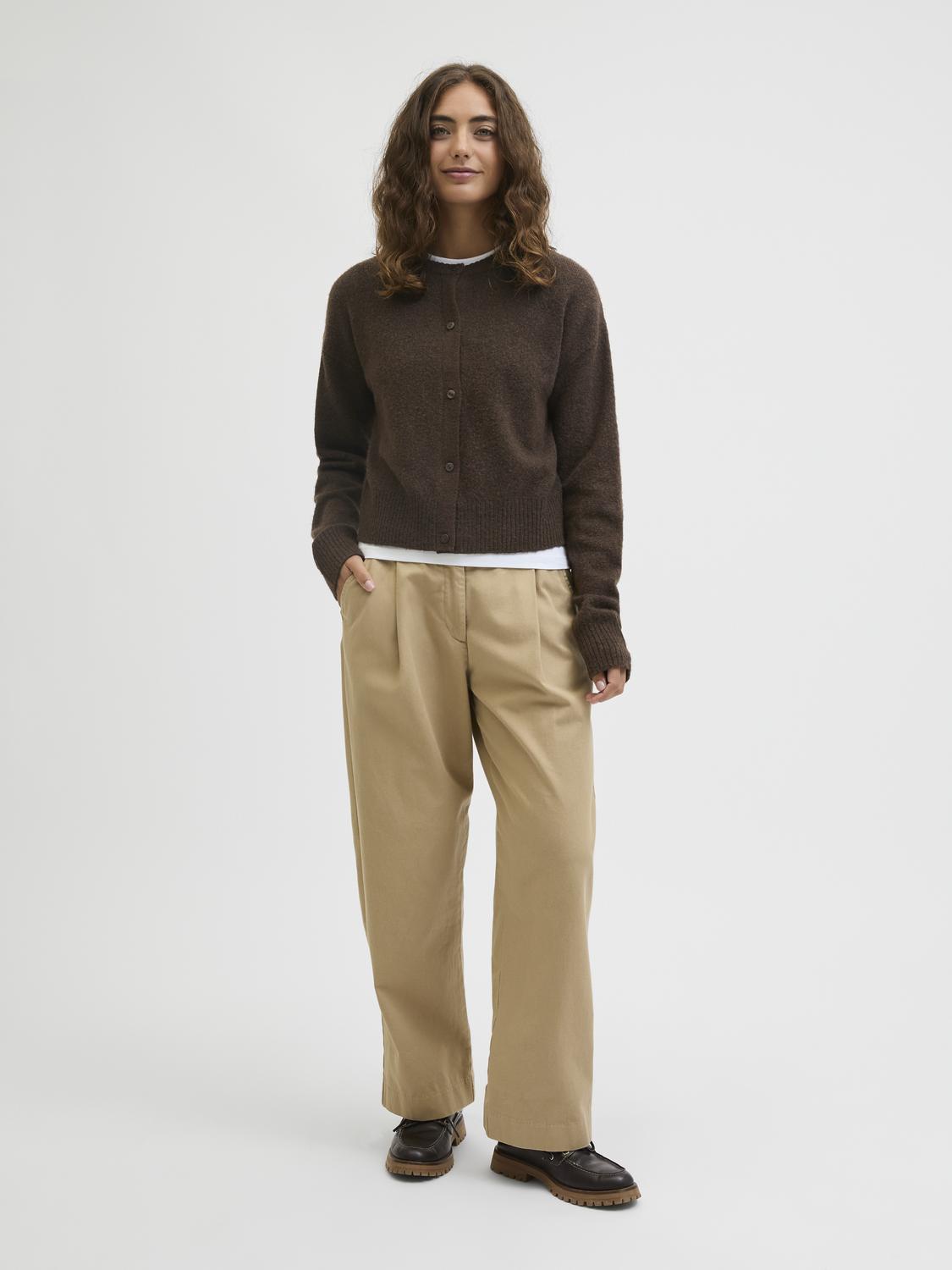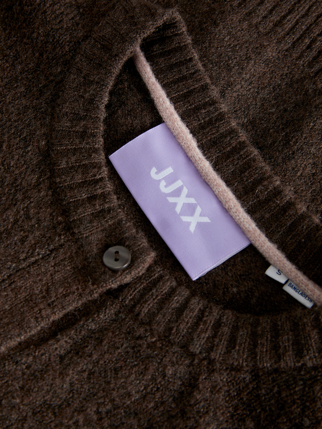 Brun cardigan fra JJXX med praktisk knaplukning foran, der gør det nemt at regulere varmen under indkøbsture og ærinder. De lange ærmer og den runde halsudskæring giver et klassisk udtryk, mens ribkanterne sikrer en god pasform.