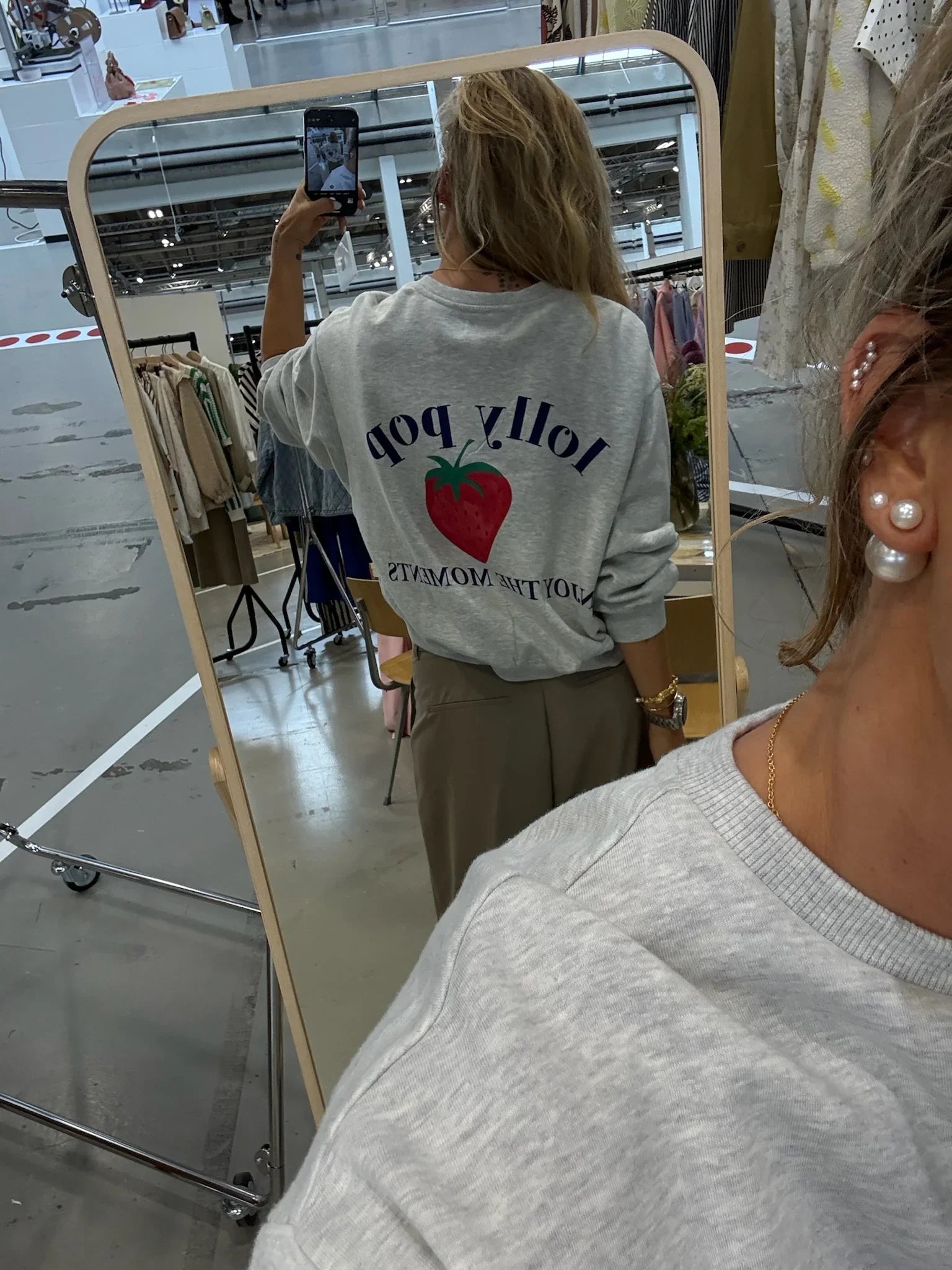 Sydney Strawberry er en sweatshirt i en blød og behagelig kvalitet, der kombinerer komfort med et legende udtryk. Den er designet i en klassisk grå melange og prydet med et charmerende jordbærprint. Foran har den Lollys Laundry logo samt et lille jordbærprint, mens ryggen er dekoreret med et stort jordbærprint og teksten “Lolly pop – enjoy the moments”, som giver sweatshirten et afslappet og feminint look.