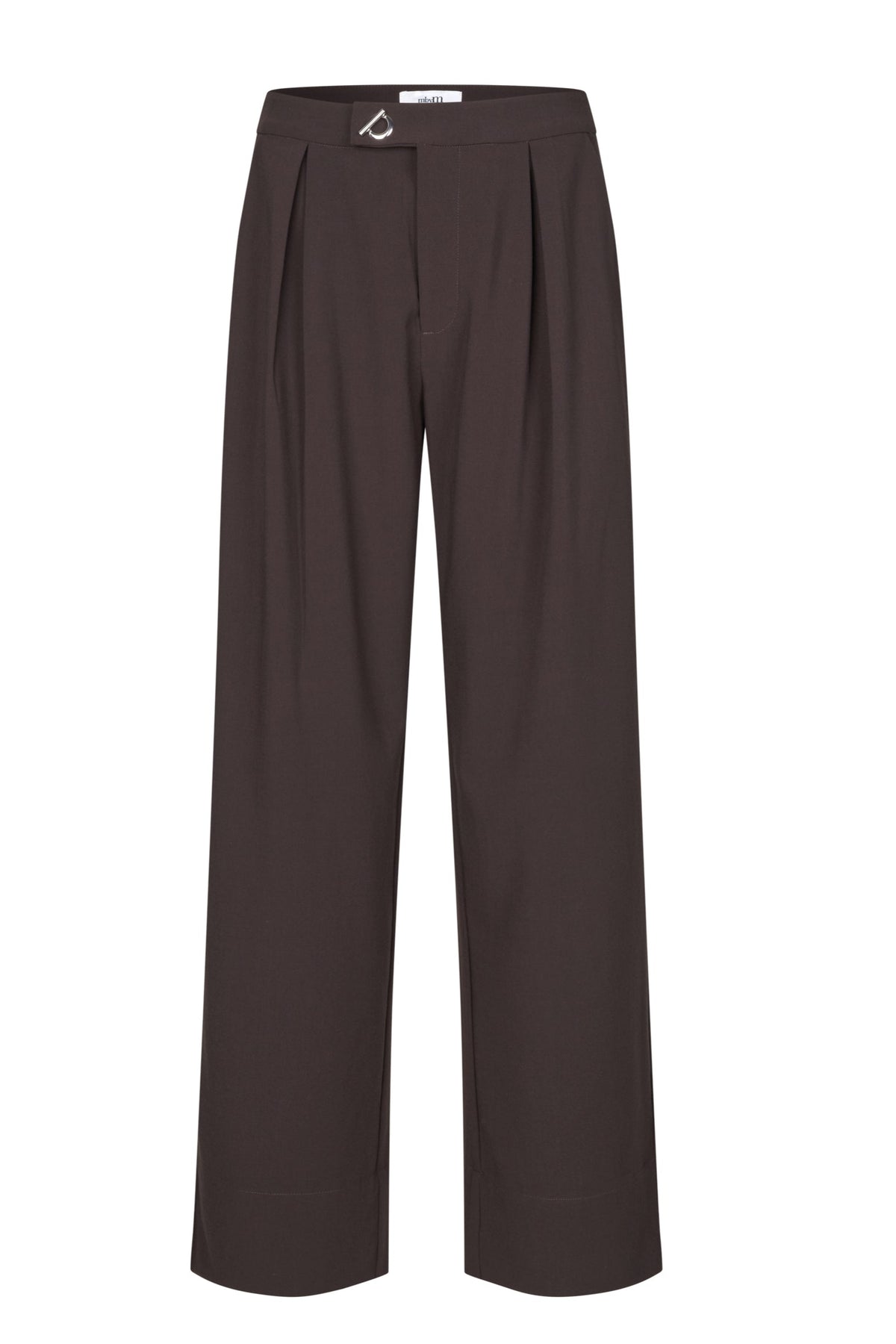 Bukserne har en bred, lige pasform med læg foran og sølvfarvet lukningsdetalje ved bæltekanten.