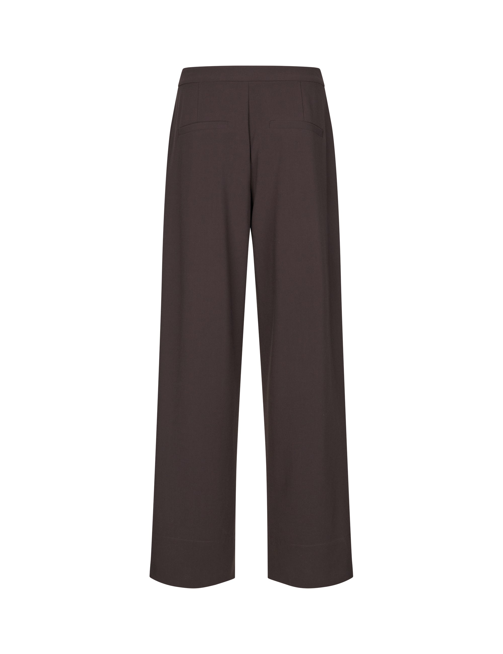 Rosalyn-bukserne fra MbyM har en straight fit med læg foran, der gør dem ideelle til afslappede cafébesøg. Den fleksible taljehøjde kan justeres efter dit ønske, og den brune farve er let at style.