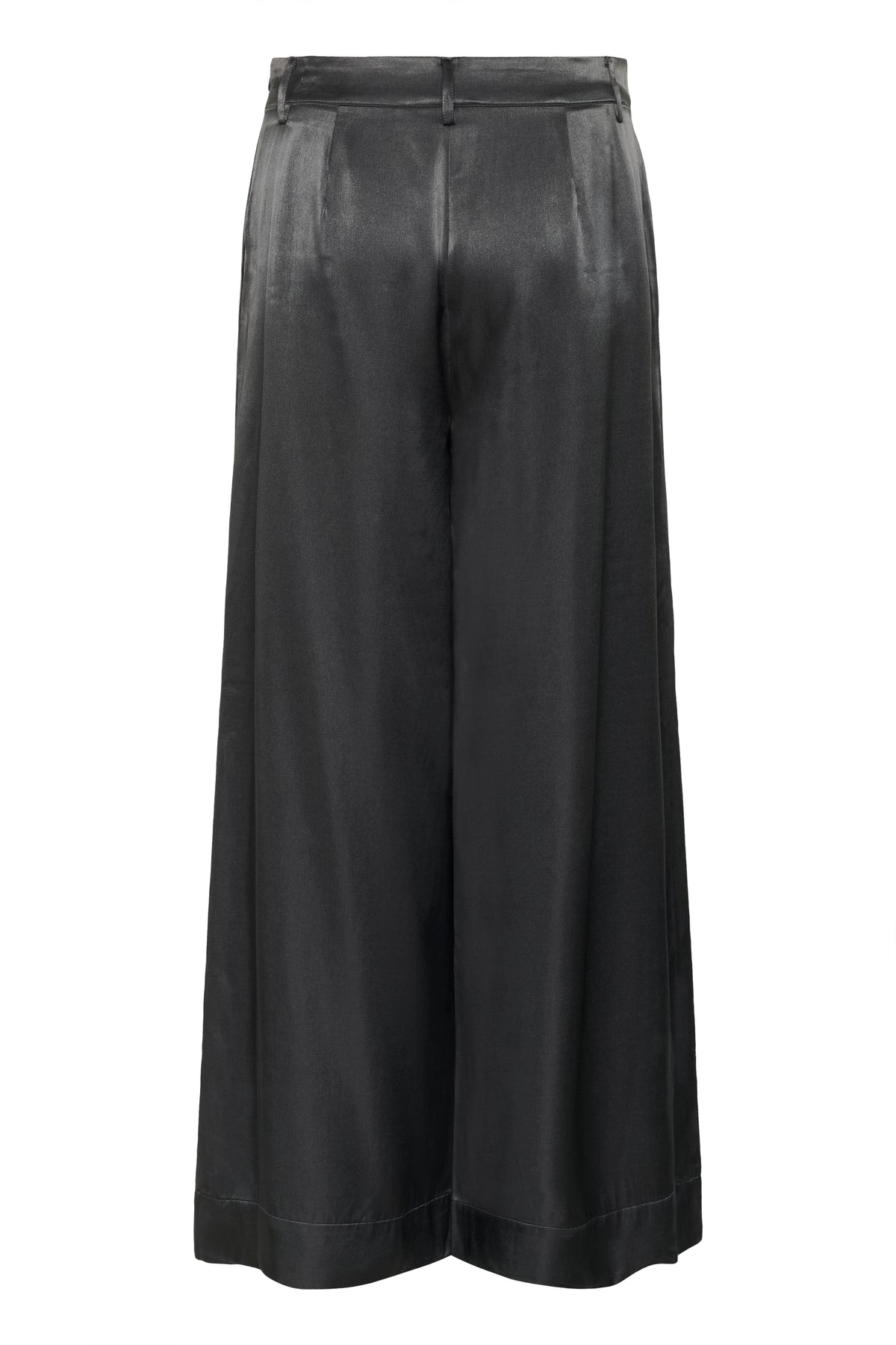 Disse sorte wide-leg bukser i satin bringer elegance og komfort i perfekt balance. Det let skinnende stof falder smukt og giver et eksklusivt udtryk, der kan styles både til hverdag og fest. Bukserne har en høj talje med bæltestropper, læg foran og en flydende silhuet, som giver et feminint og sofistikeret look.