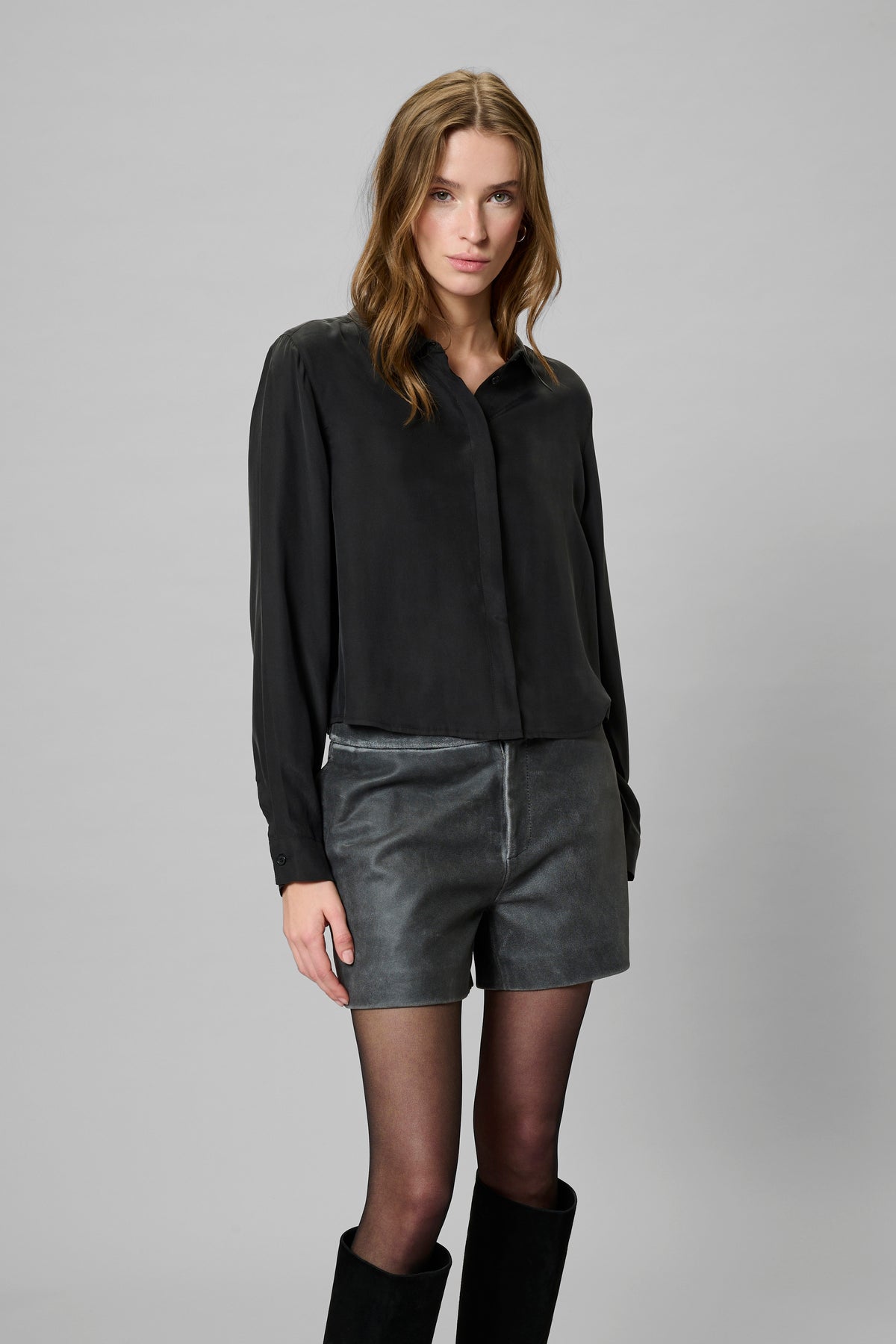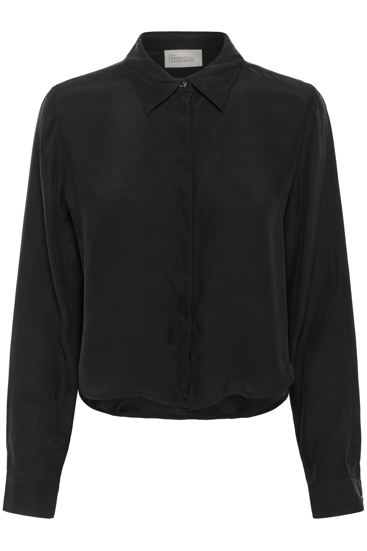 Elegant og tidløs sort silkeskjorte fra My Essential Wardrobe, fremstillet i 100% silke. Den korte pasform giver et moderne udtryk, mens det bløde og lette silkestof sikrer en luksuriøs fornemmelse mod huden. Skjorten har klassisk krave, skjult knaplukning og lange ærmer med manchetter – perfekt til både hverdagsbrug og festlige anledninger.