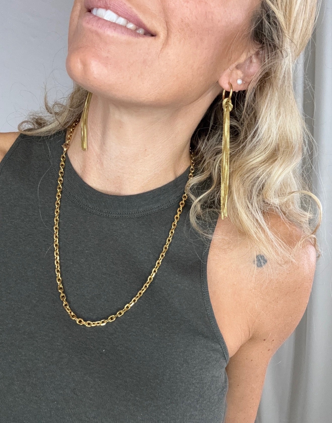 Fie øreringe fra Nine kombinerer runde hoops med lange, bevægelige kædesnore. De hængende kæder skaber et iøjnefaldende udtryk, der passer særligt godt til festlige anledninger. Øreringene er vandtætte og sælges som par.