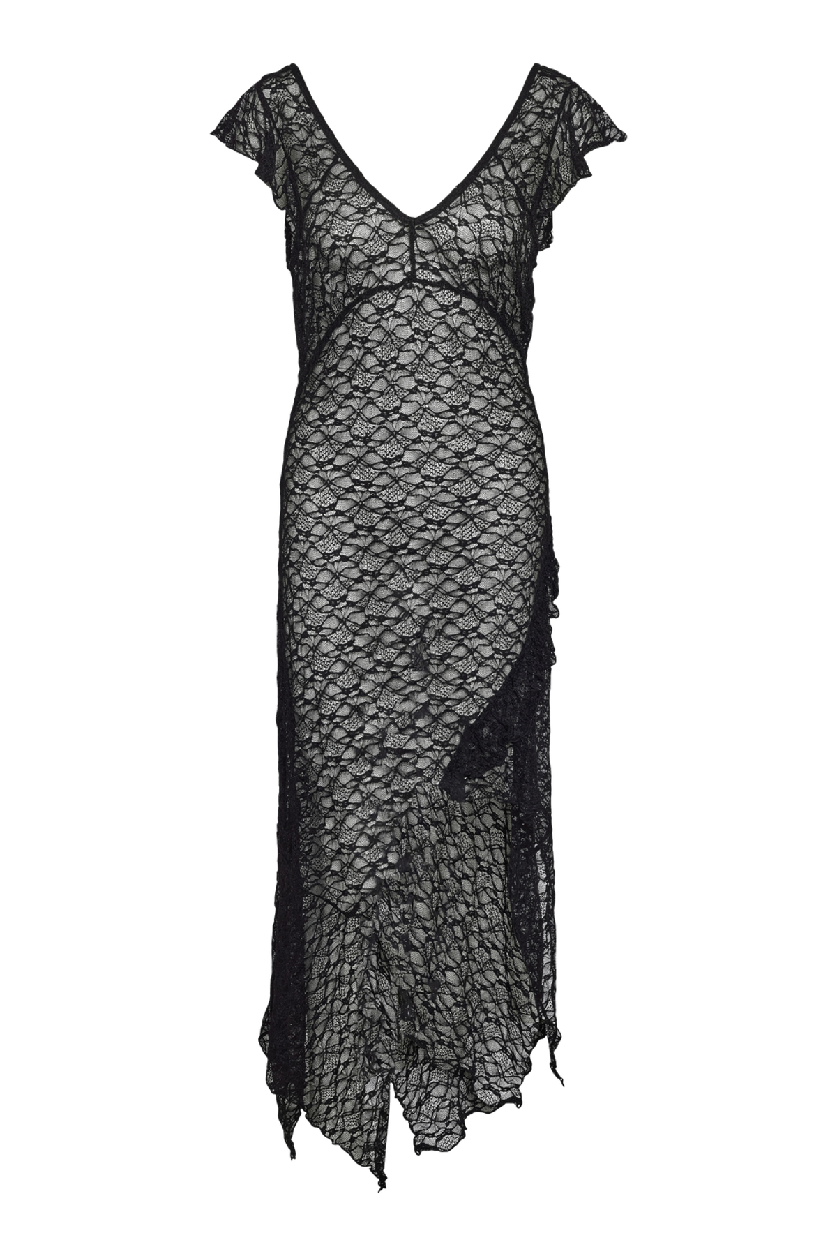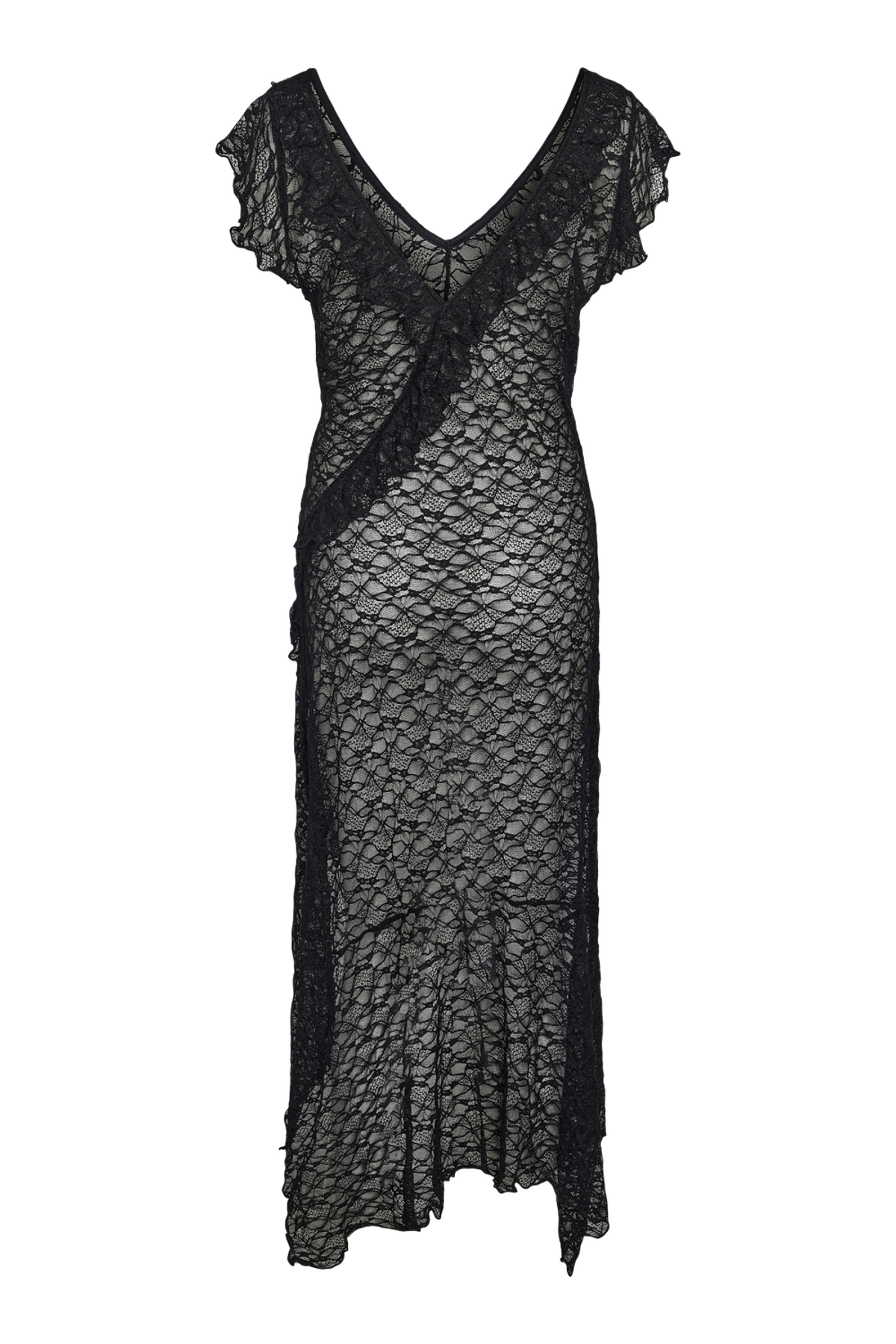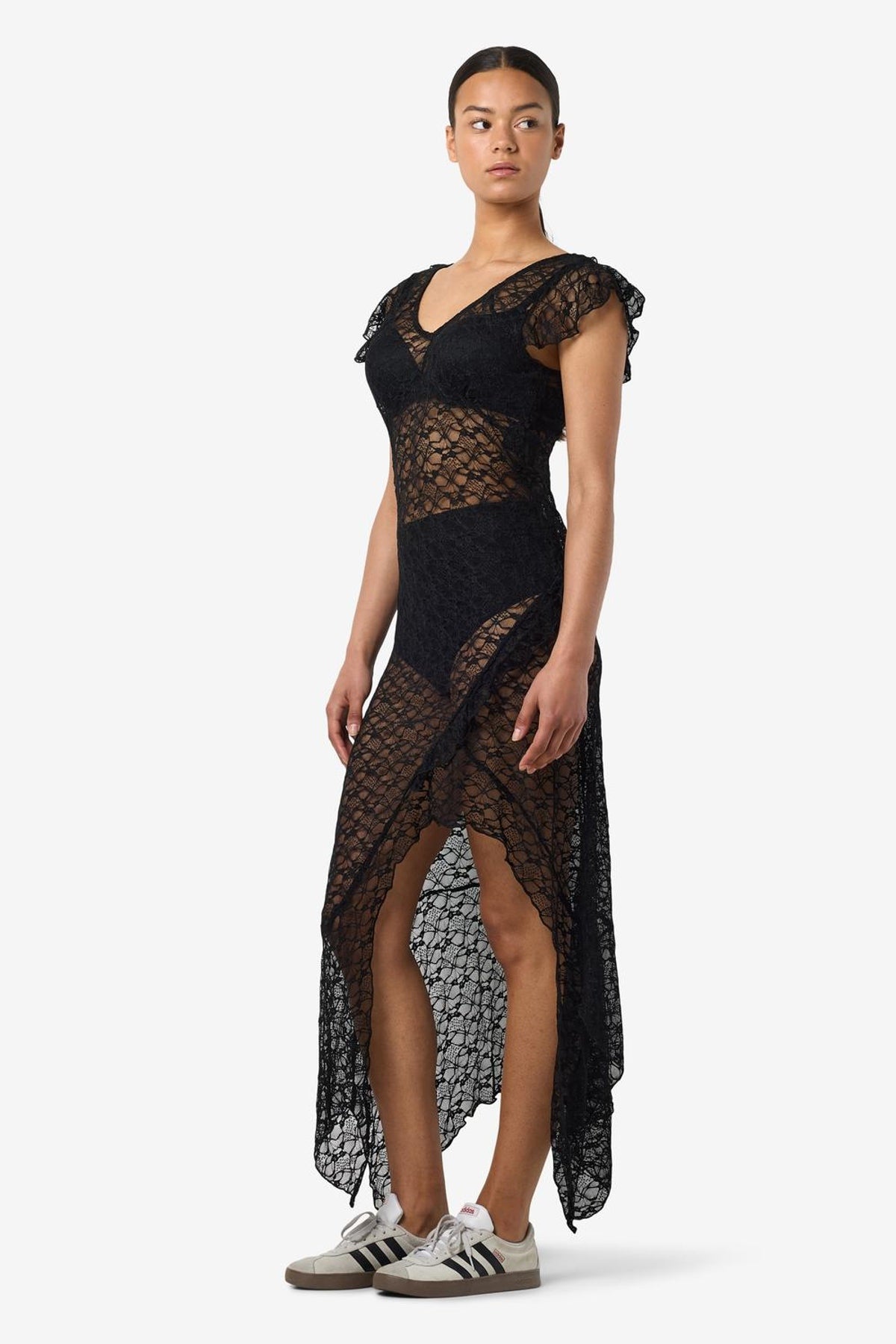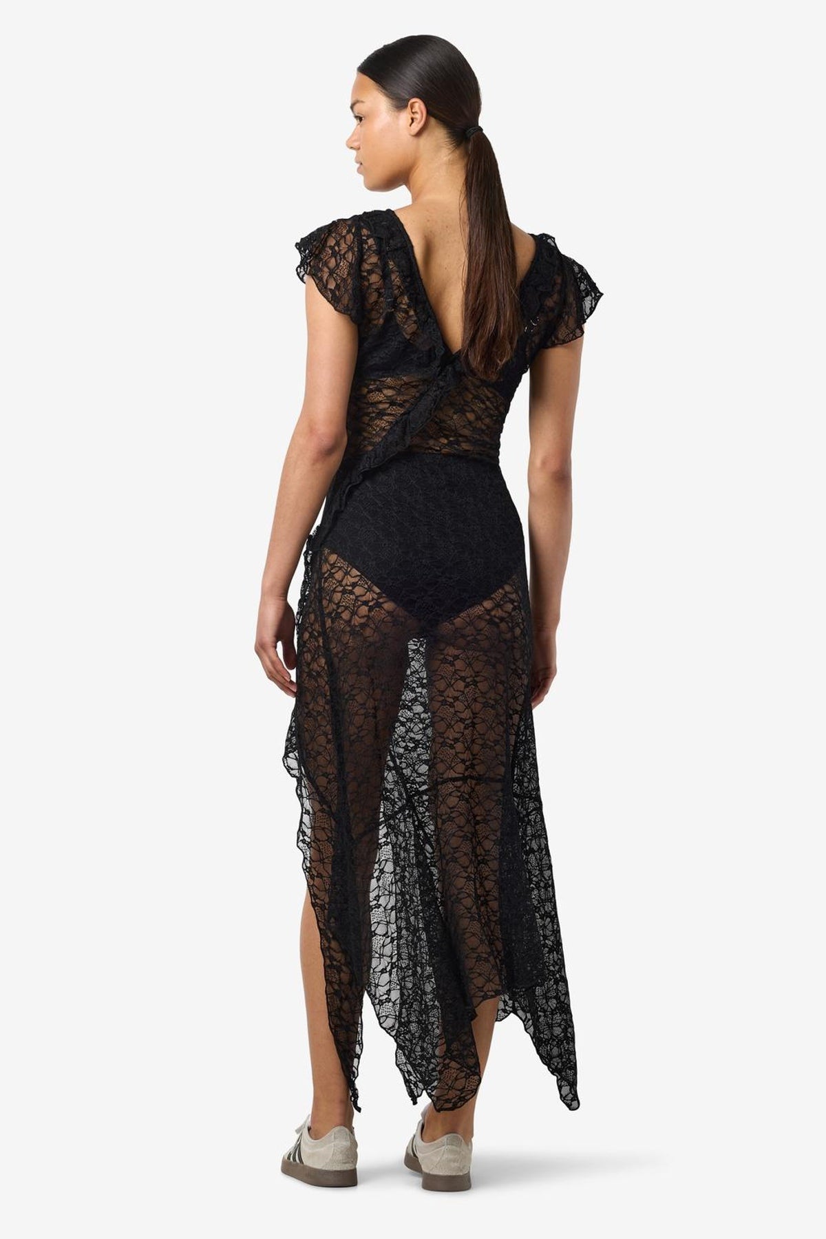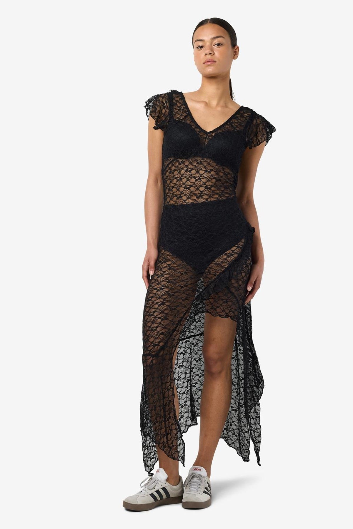En lang blondekjole fra Noisy May, i almindelig pasform med V-udskæring og korte ærmer. Kjolen har maxi-længde og fine cutlines, og den sorte farve gør den alsidig til både hverdag og særlige lejligheder. Stoffet med høj nylon-andel giver en glat, let kvalitet med en smule stretch for bevægelsesfrihed.