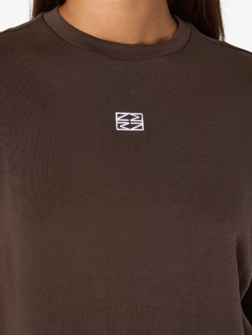 Let oversize brun t-shirt fra Noisy May. Tshirten har en rund halsudskæring, et længere tshirt ærme, samt Noisy May logo på fronten. Tshirten er lidt længere bagtil end fortil.
