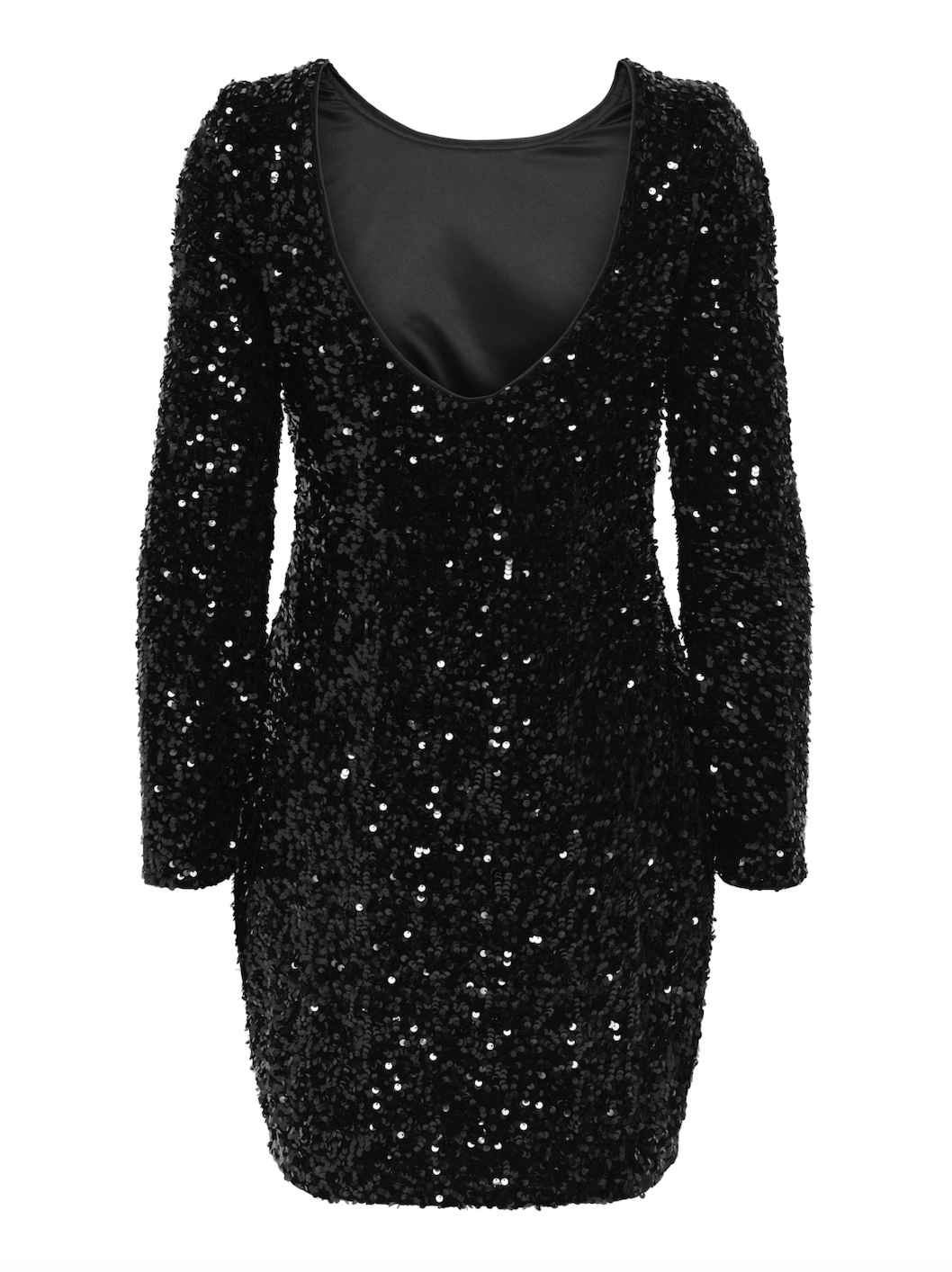 Kjolen er dækket af glitrende sorte palietter, der fanger lyset fra alle vinkler og giver et elegant, festligt udtryk. Den har lange ærmer og en tætsiddende pasform, der fremhæver figuren. Forsiden har en klassisk rund halsudskæring, mens bagsiden byder på en flot dyb V-udskæring, der tilfører et feminint og sensuelt twist.