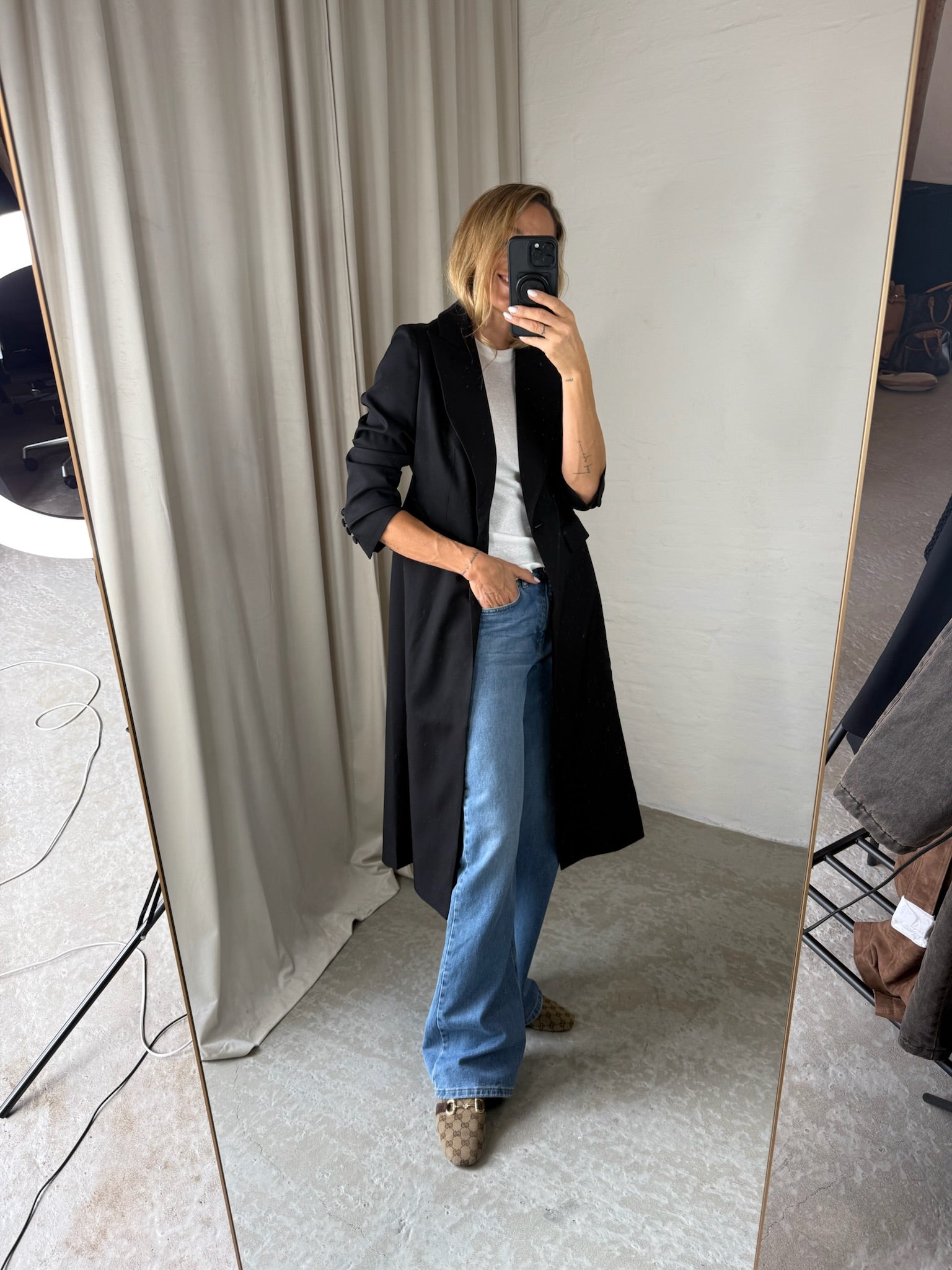 En lang sort blazer trenchcoat fra Sassy Copenhagen. Jakken har en v-udskæring og lukkes med en knap foran. Derudover er den tætsiddende ved taljen som giver figur og så har den to lommer foran.