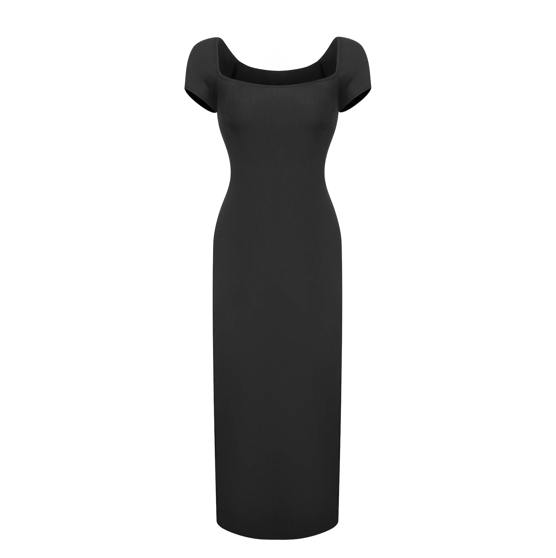 En stilren sort kjole, der kombinerer minimalisme, elegance og en perfekt pasform – et must-have i enhver garderobe.