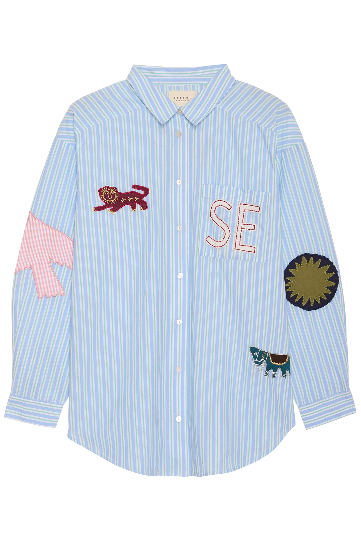 Skjorten er rigt dekoreret med charmerende motiver som en løve, en fugl og et sødt æsel. Motiverne er udført i en smuk kombination af leftover tekstiler, ensfarvet bomuld og fine broderidetaljer, hvilket giver hver skjorte sit helt eget udtryk.