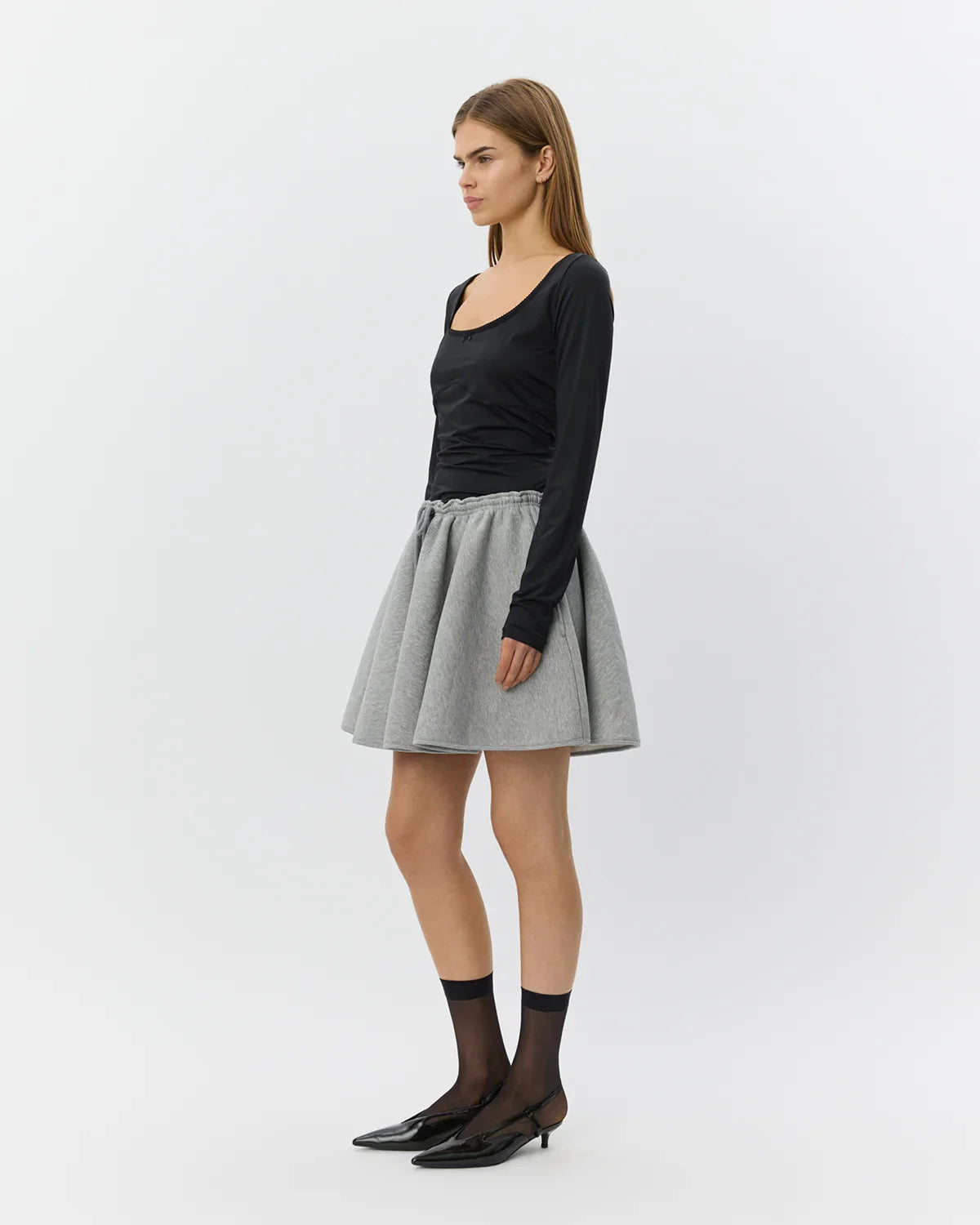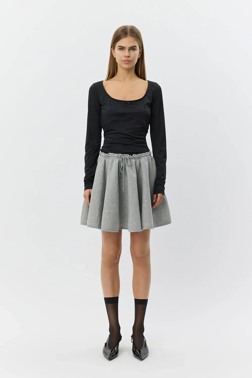 Jessica nederdelen fra Sofie Schnoor er en cool og komfortabel mininederdel i en blød grå melange kvalitet. Den har en A-formet silhuet, som falder flot og giver et feminint udtryk med masser af bevægelse.