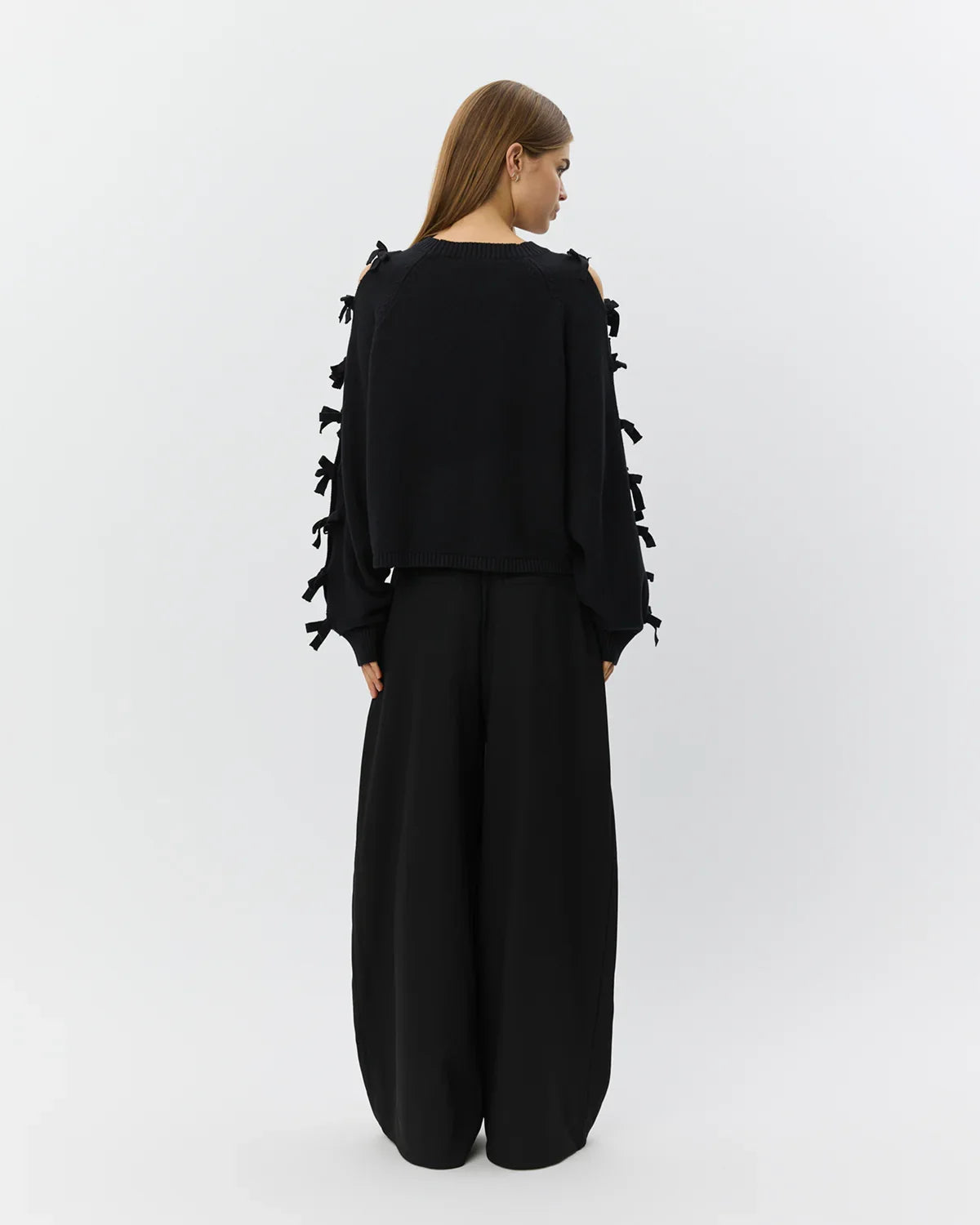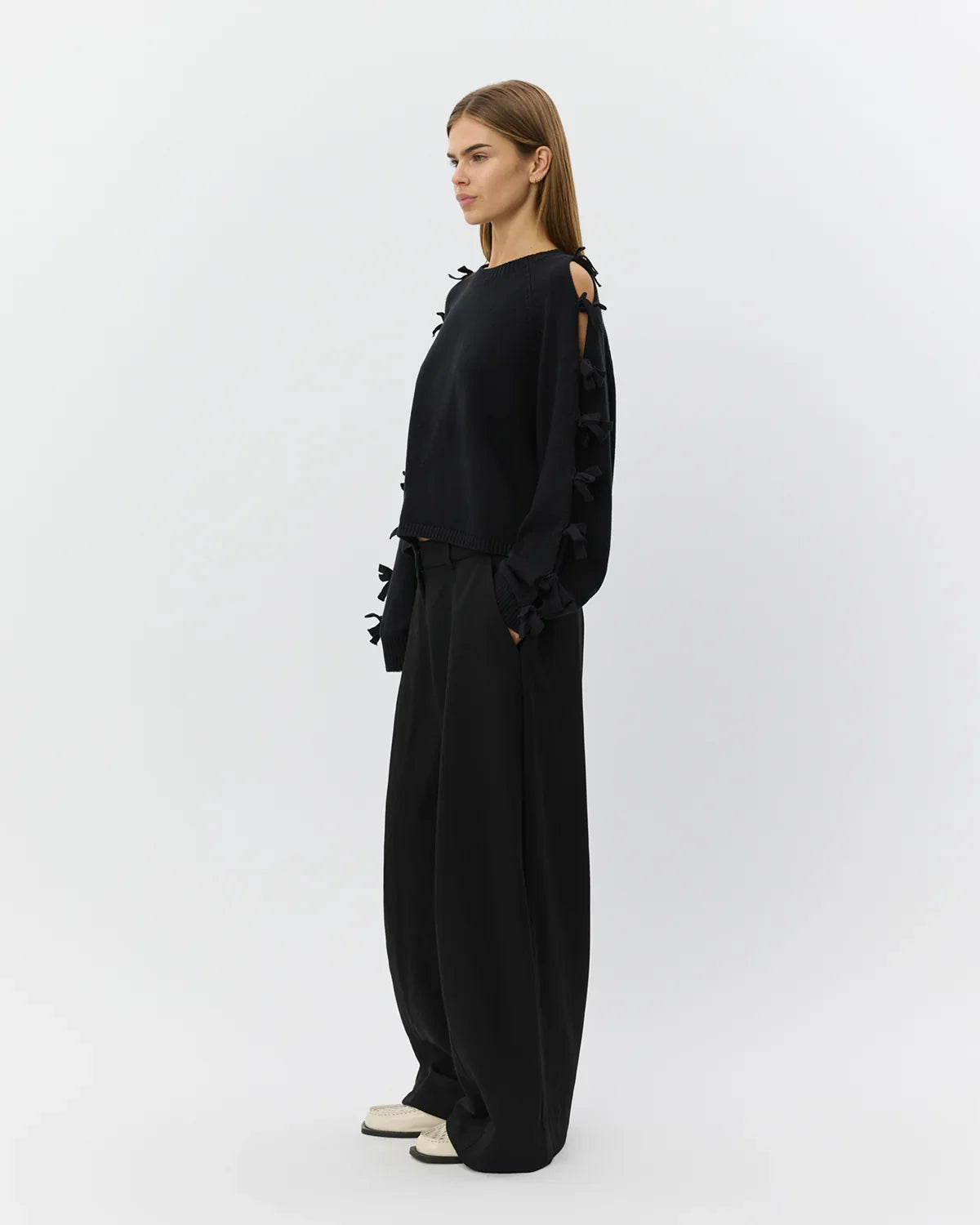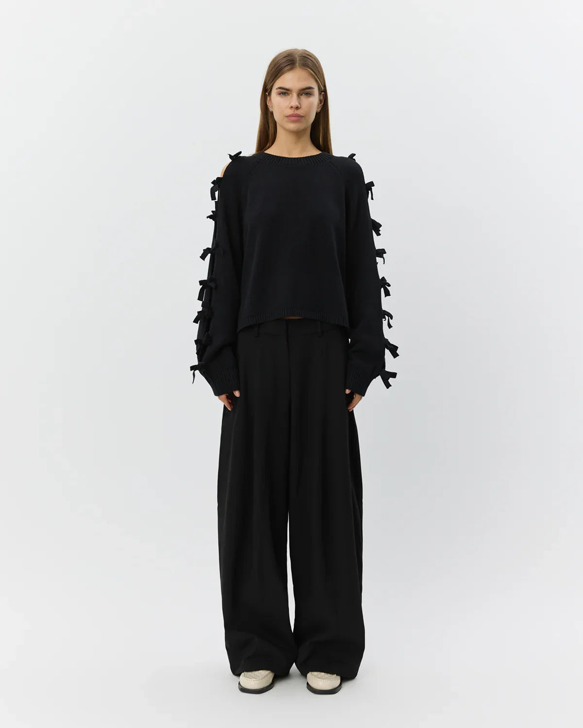 Permeli sløjfestrik fra Sofie Schnoor er en elegant og moderne strik med et feminint twist. Modellen har et regular fit, der giver et afslappet, men stilrent udtryk. De karakteristiske slidser langs ærmerne er dekoreret med fine sløjfer hele vejen ned, som tilfører designet et eksklusivt og legende look. Strikken har rund hals samt ribkanter ved hals, ærmer og bund, der sikrer en flot pasform og en behagelig finish. Perfekt til både hverdag og mere stylede anledninger.