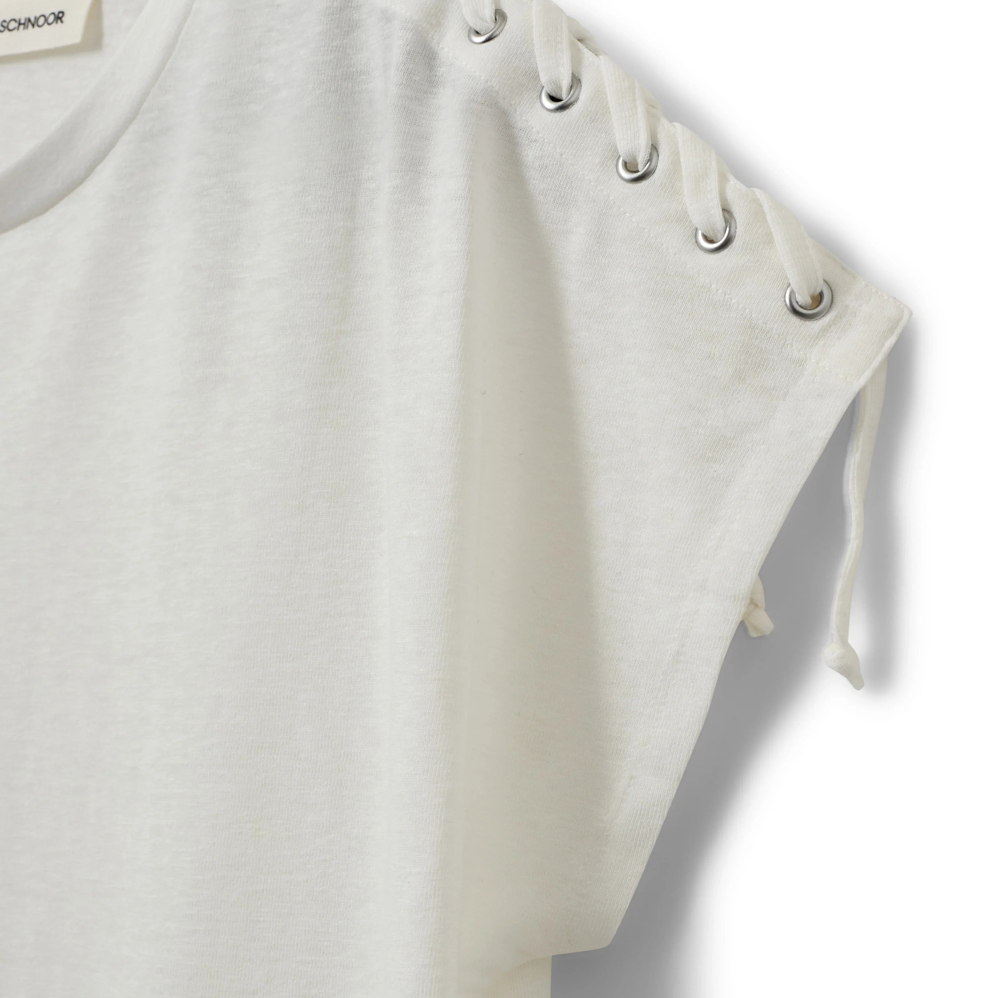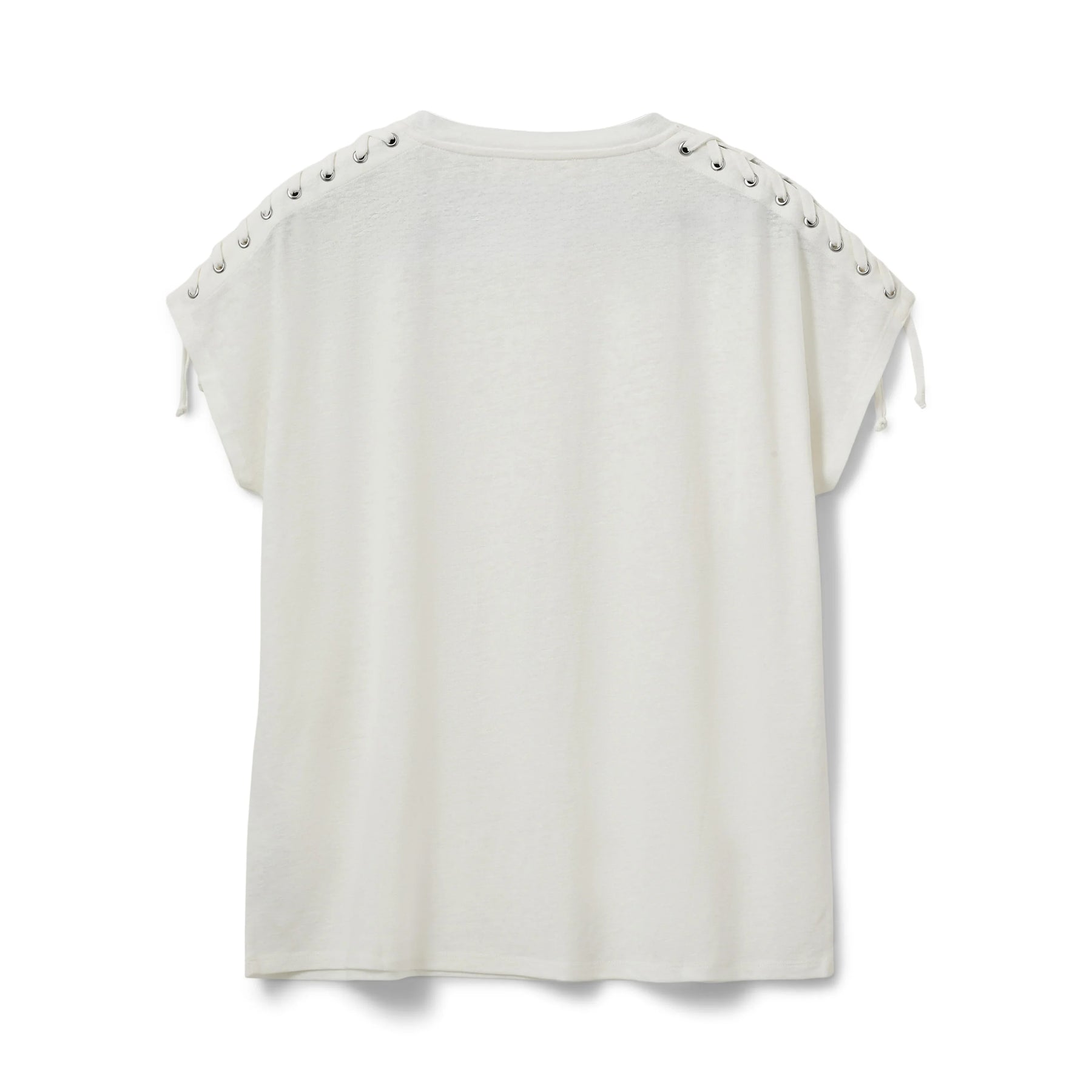 De dekorative snøredetaljer med metaløjer langs skuldrene tilfører et feminint og råt twist til det enkle design. En alsidig T-shirt, der er perfekt til varme dage og nem at style til både hverdag og mere elegante looks.