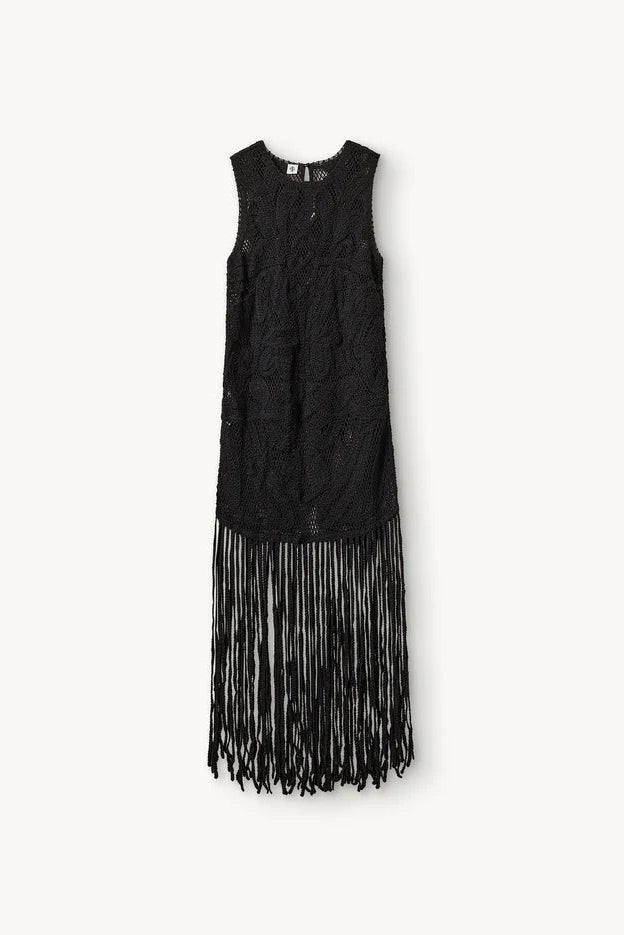 Kim Dress fra The Garment er en ærmeløs, broderet kjole med et let og feminint udtryk. Den transparente struktur og de dekorative mønstre giver et eksklusivt look, mens de lange frynsedetaljer ved kanten tilfører bevægelse og et legende twist. Silhuetten er enkel og elegant, hvilket gør kjolen alsidig – perfekt både til afslappede hverdagslooks og til mere opgraderede, festlige anledninger.