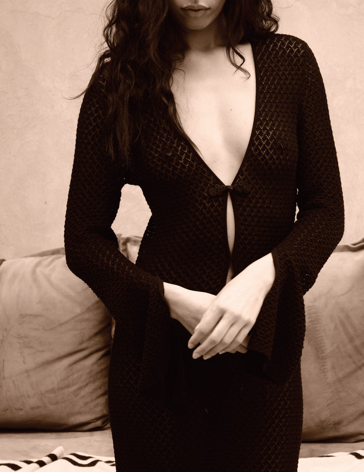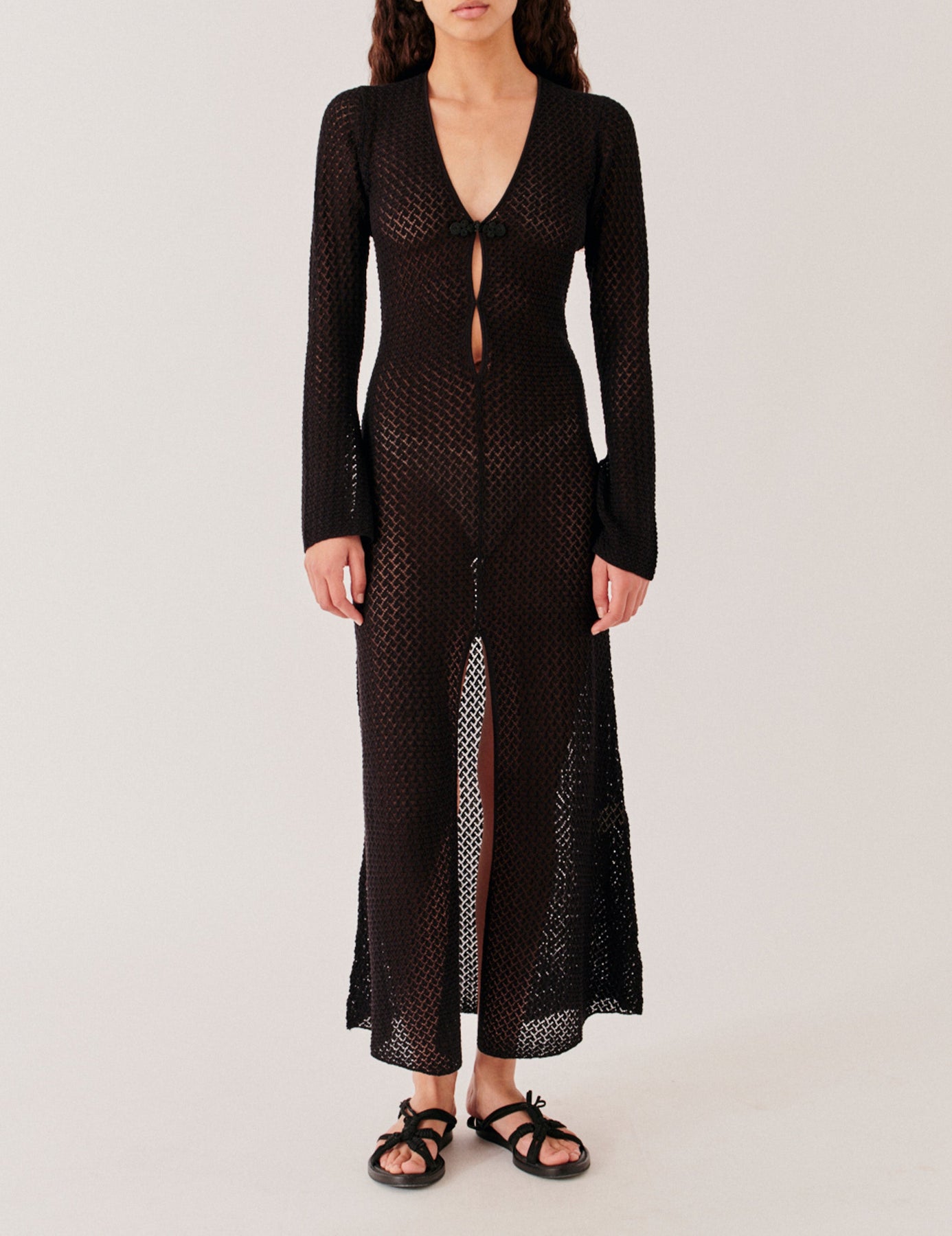 Denne kjole fra The Garment har et særligt gennembrudt mønster og en sort spændedetalje ved halsen. Den lange silhuet og V-udskæringen gør den passende til festlige anledninger, hvor den holder dig komfortabel.