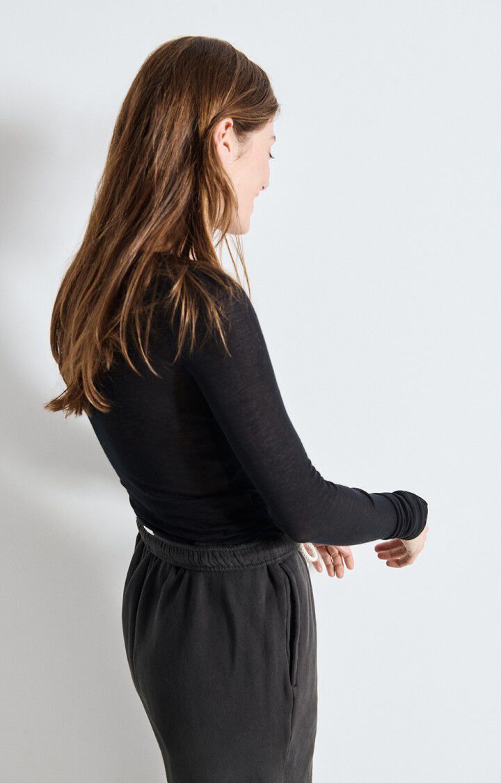 Blusen har et enkelt og stilrent design med rund halsudskæring og et figursyet snit, der smyger sig flot til kroppen uden at stramme. Den dybe sorte farve gør den ekstra alsidig – perfekt som lag-på-lag under strik, blazer eller jakke, men også flot alene til både jeans, nederdel eller afslappede hverdagslooks.