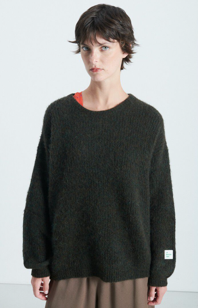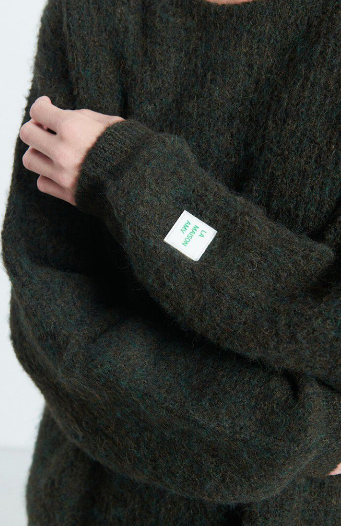Den løse, oversize pasform gør strikken perfekt til lag-på-lag styling, mens den runde halsudskæring og det diskrete La Maison AMV-logo på ærmet understreger brandets karakteristiske, afslappede elegance.