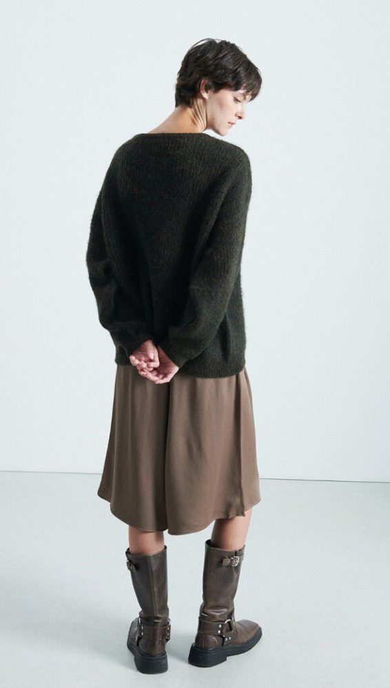 American Vintage East-strikken i farven Spruce Melange er indbegrebet af afslappet luksus og komfort. Den bløde strik er fremstillet i en nøje afbalanceret blanding af 35 % akryl, 31 % alpaka, 22 % polyamid, 11 % uld og 1 % elastan, som giver en varm, let og fleksibel kvalitet.