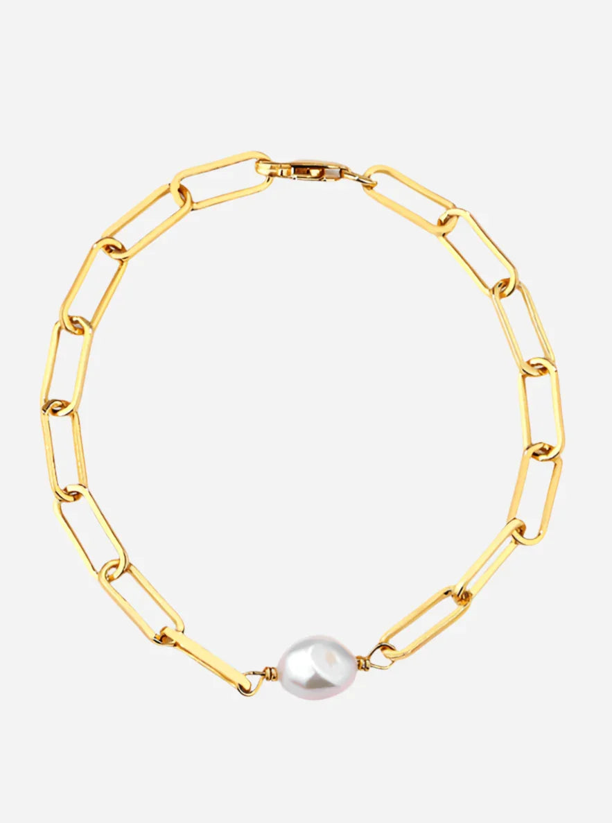 Dette Andcopenhagen-armbånd kombinerer store kædeled med en markant perle. Armbåndet er 100 % nikkelfrit og har justerbar længde, så det passer til dit håndled. Dobbelt guldbelægning sikrer lang holdbarhed.