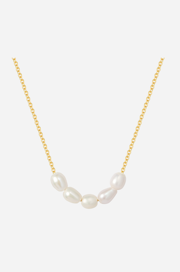 Andcopenhagen Cille necklace combines irregular freshwater pearls with 18 karat gold-plated stainless steel. The adjustable length and nickel-free composition make it suitable for sensitive skin.