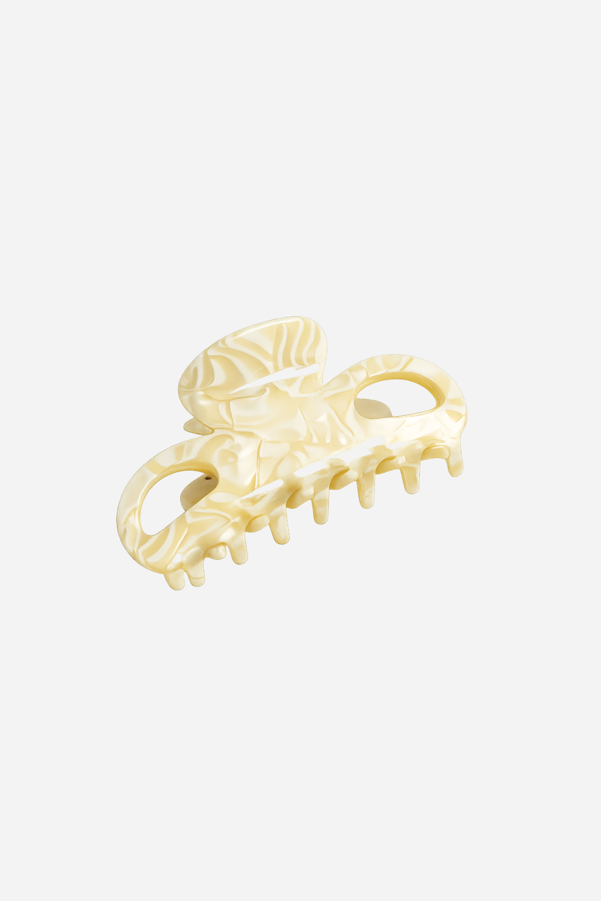 En elegant hårklemme i off white med et blødt, marmoreret mønster, der giver et eksklusivt og tidløst udtryk. Klemmen har en organisk, let skulpturel form med afrundede greb, som sikrer både komfort og et godt hold i håret. Det neutrale farvespil gør den nem at kombinere med enhver garderobe – perfekt til både hverdagsbrug og mere festlige anledninger. En stilren detalje, der samler håret med et enkelt, sofistikeret look.
