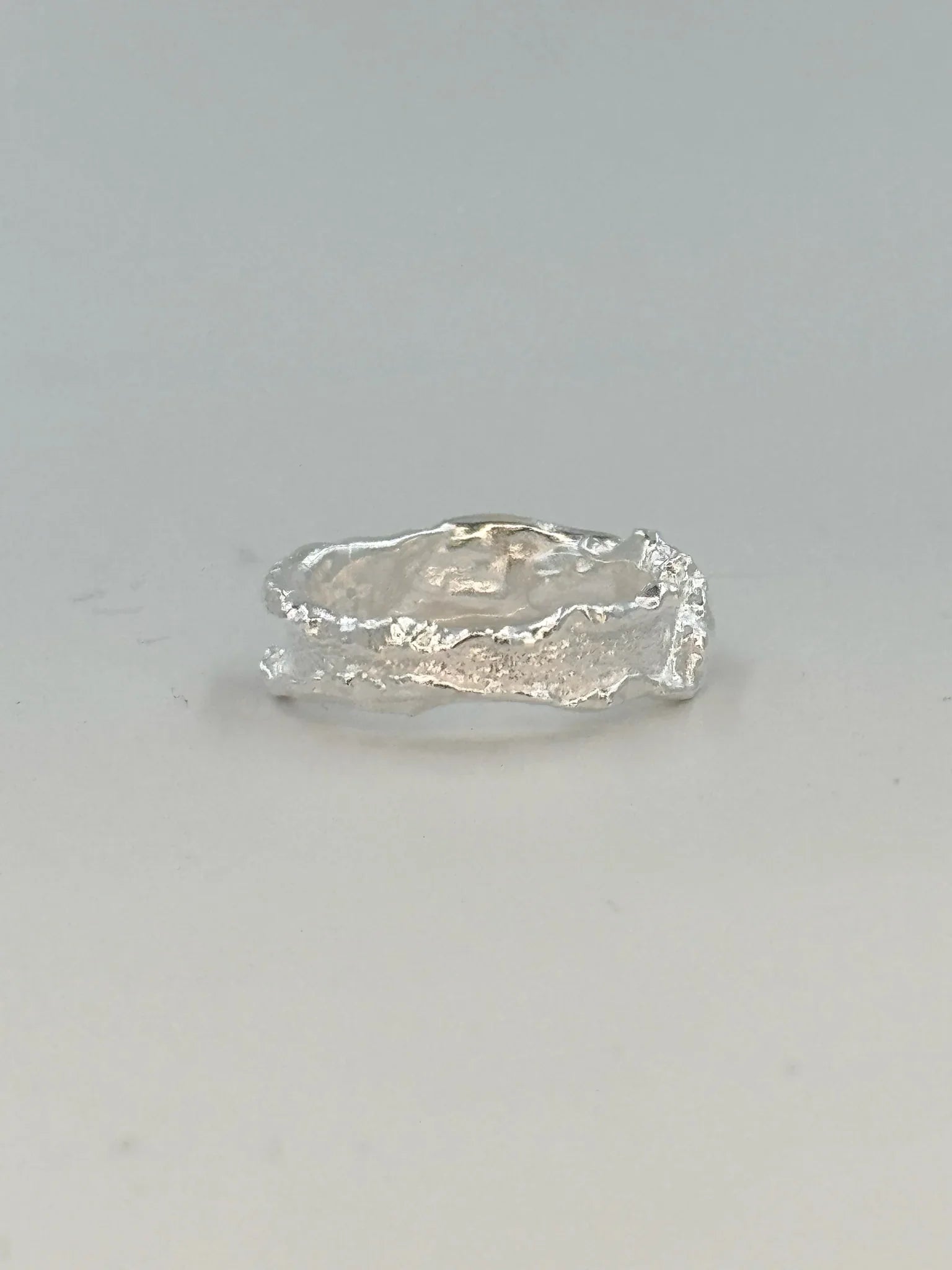 Vega-ringen fra Andcopenhagen har en rustik, organisk form med ujævn overflade, der skaber dybde og karakter. Den justerbare størrelse gør den fleksibel til forskellige fingre.