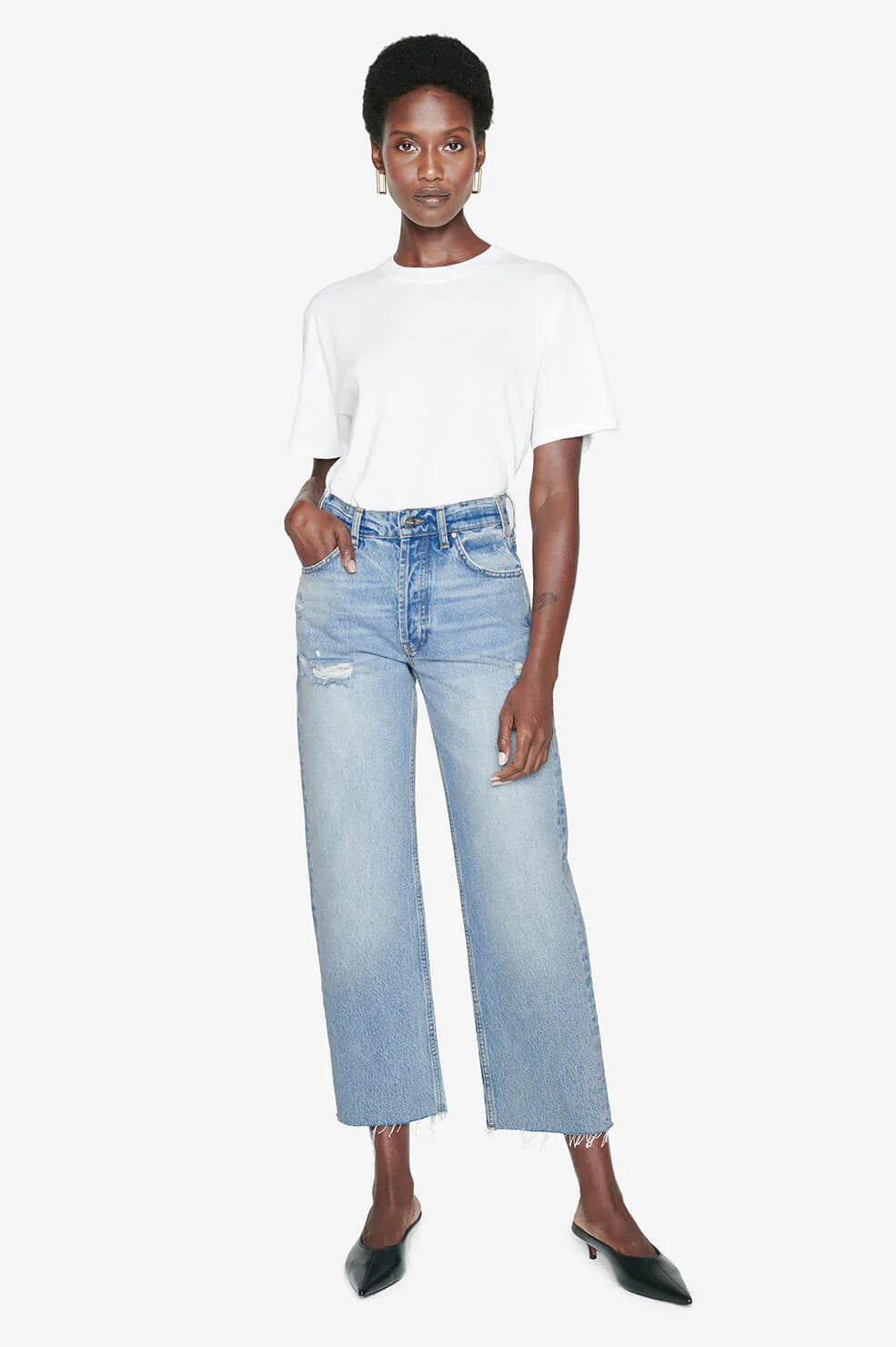 Gavin Jean er en moderne boyfriend-inspireret model lavet af 100% bomuldsdenim i en stiv kvalitet, med en falmet lys blå vask og autentisk vintage-karakter, herunder slidte baglommer, marmorerede detaljer og variationer i farven. Denne let cropped, lige pasform er afsluttet med en råkant forneden.