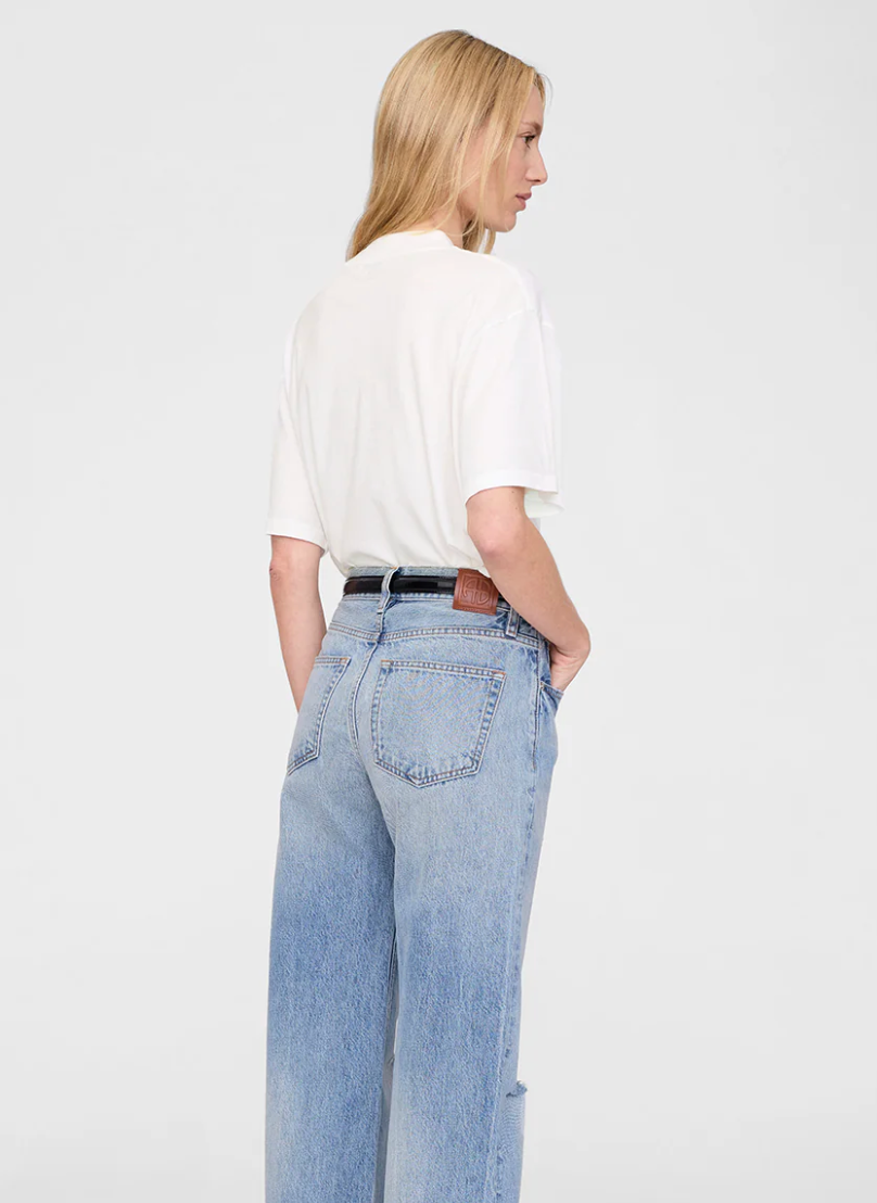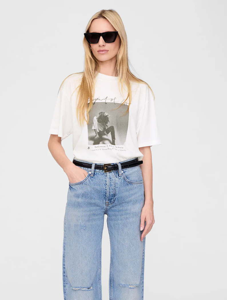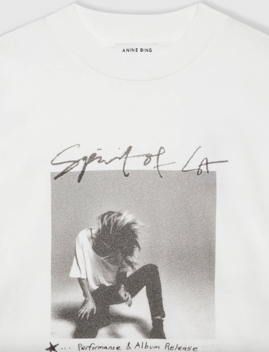 Ashton Tee Spirit er en ubesværet basis-T-shirt, lavet i en let bomuldsjersey, der føles blød og har et naturligt, afslappet fald med et autentisk, slidt udtryk. T-shirten har en afslappet, boxy pasform, en kraftig ribbet rund halsudskæring og ekstra lange korte ærmer. På fronten ses et screenprintet Spirit of LA-motiv samt et billede af Anines album THERAPY.