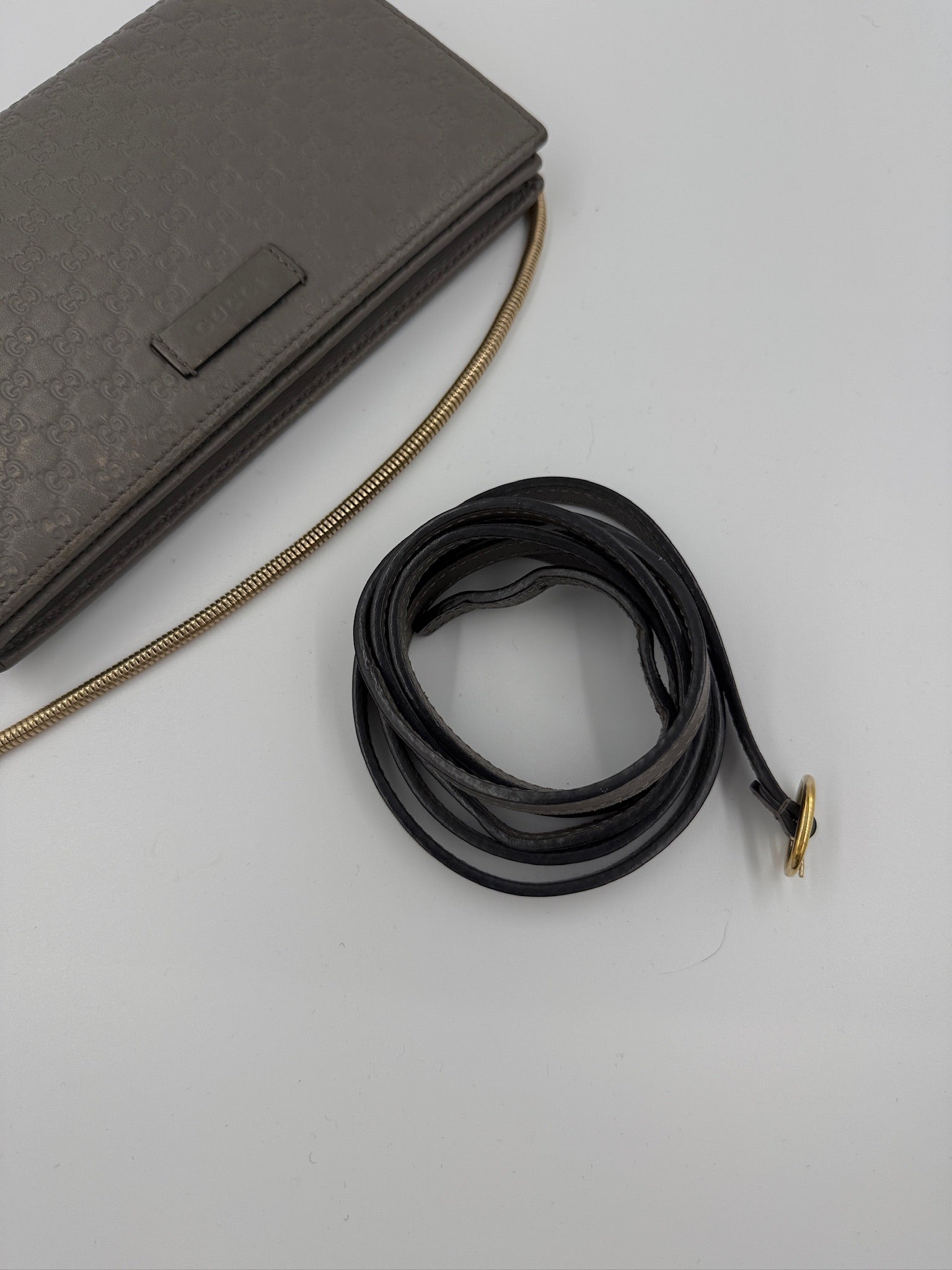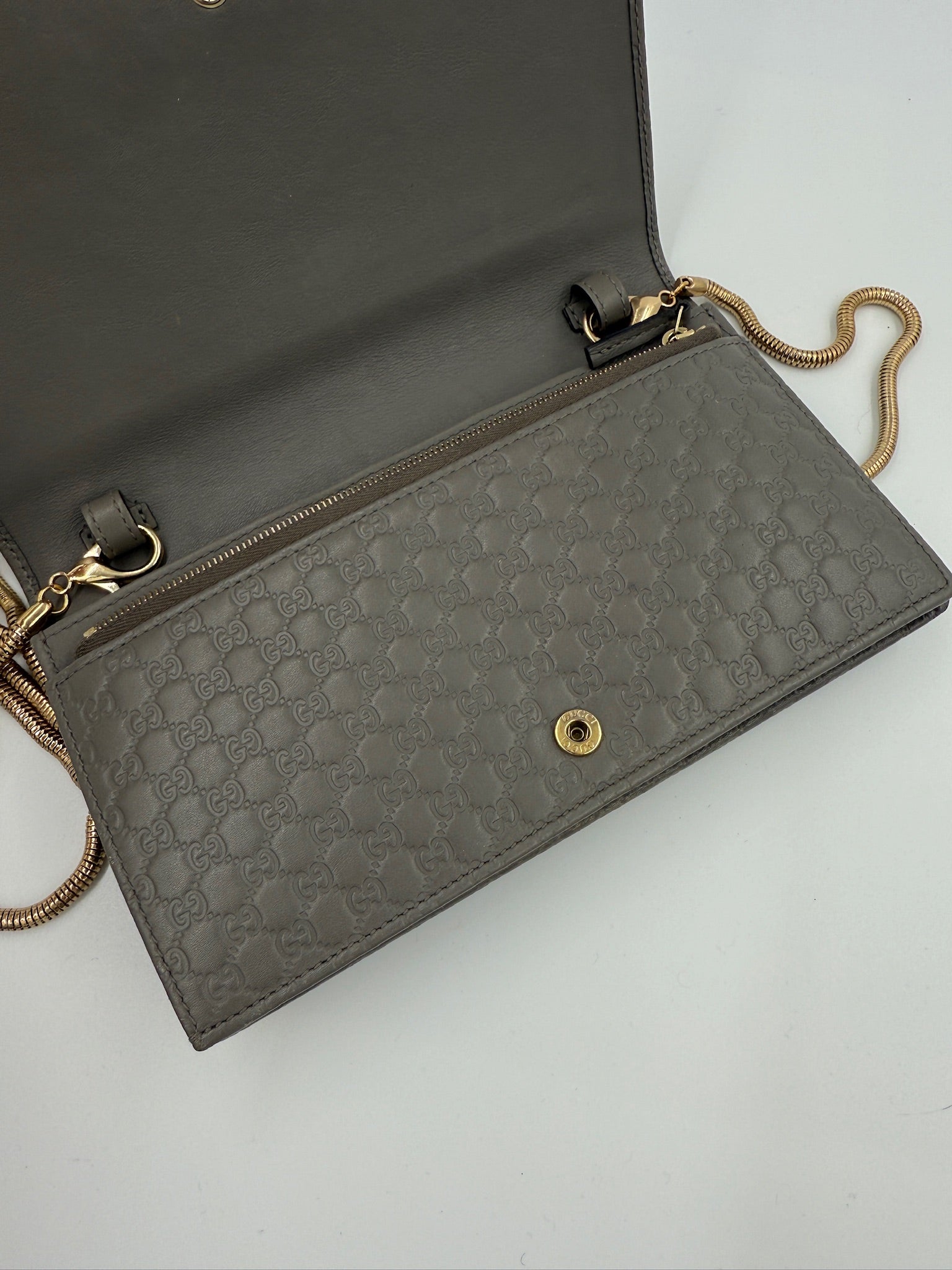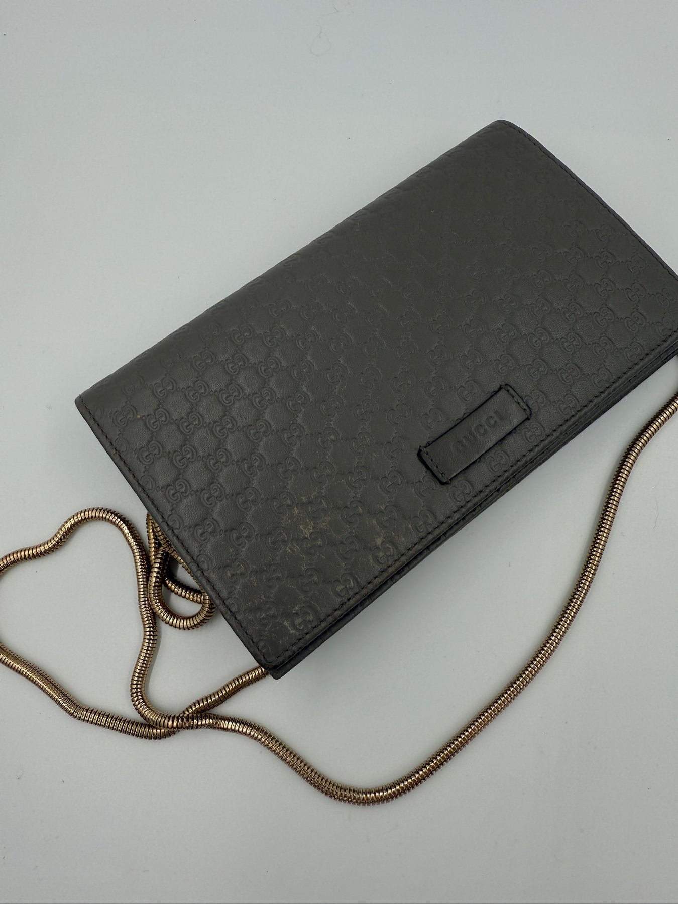 Den aftagelige guldfarvede kæderem gør den alsidig som både clutch og crossbody-pung. Et klassisk Gucci-accessory i høj kvalitet, perfekt til dig der søger en luksuriøs designerpung med ikonisk Microguccissima-mønster.