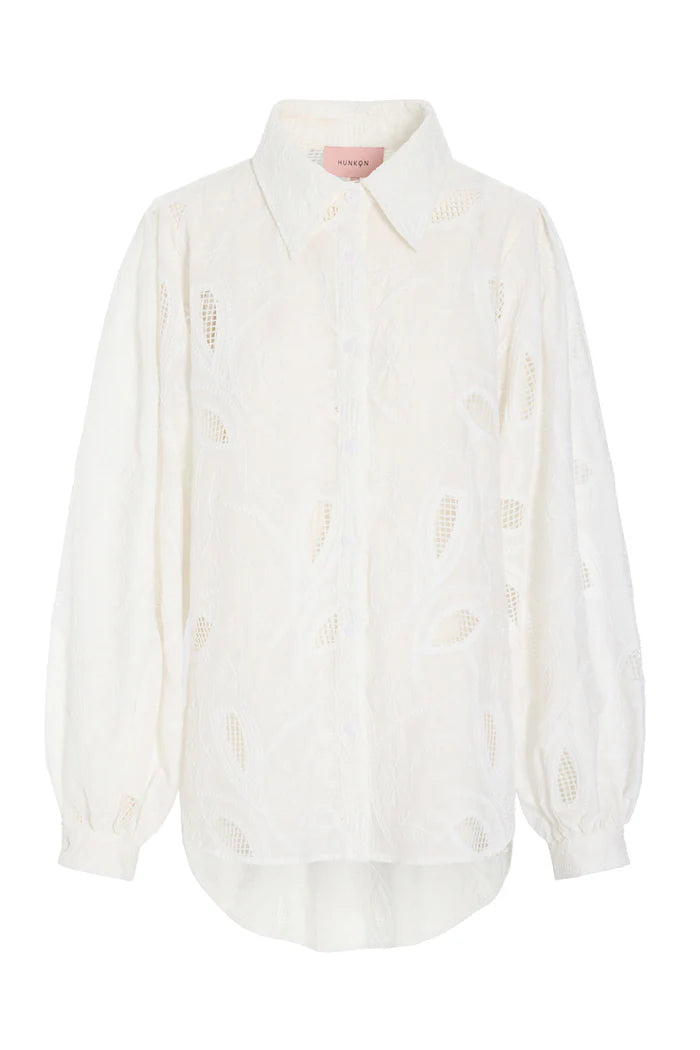 Orla skjorten fra Hunkøn er en let og feminin skjorte i hvid med et eksklusivt broderet mønster, der skaber et diskret transparent spil i stoffet. Det fine hulmønster giver skjorten et luftigt og sofistikeret udtryk, som balancerer det enkle med det detaljerige.