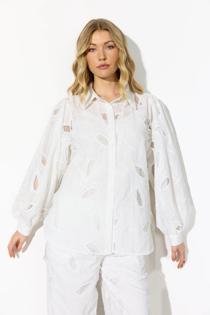 Den hvide farve fremhæver strukturen i stoffet og gør skjorten alsidig i styling – denne skjorte fungerer både som et elegant statement piece og som en let, sommerlig basis i garderoben.