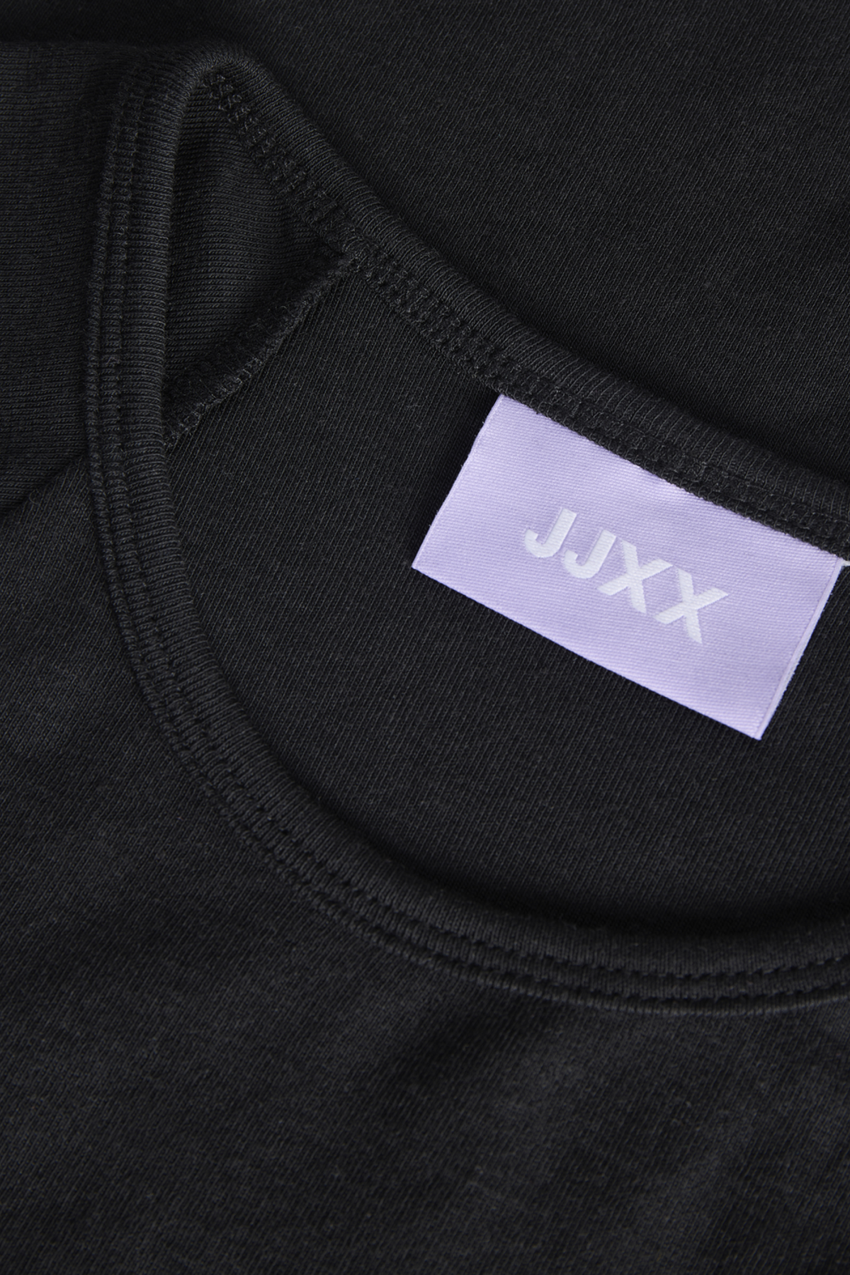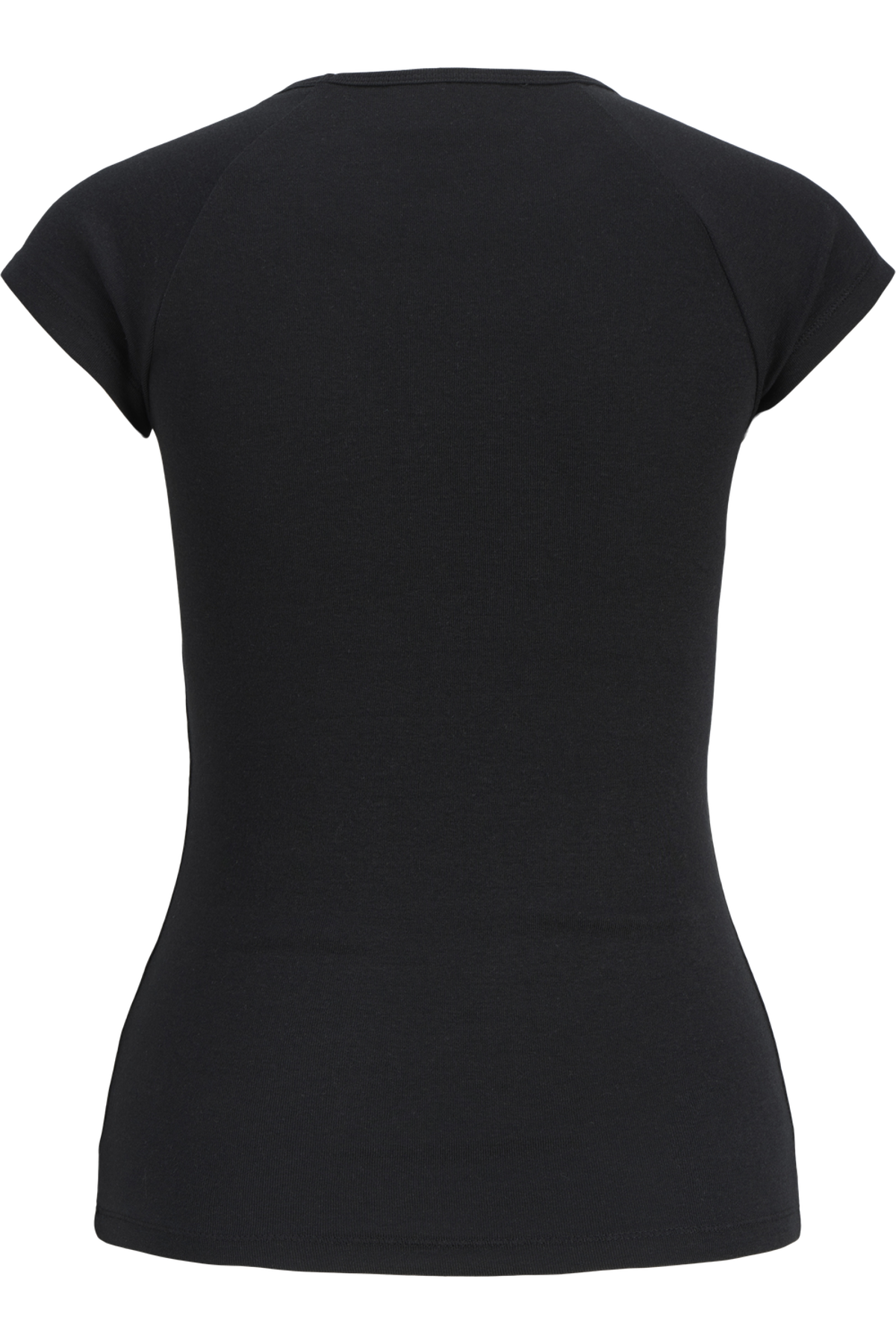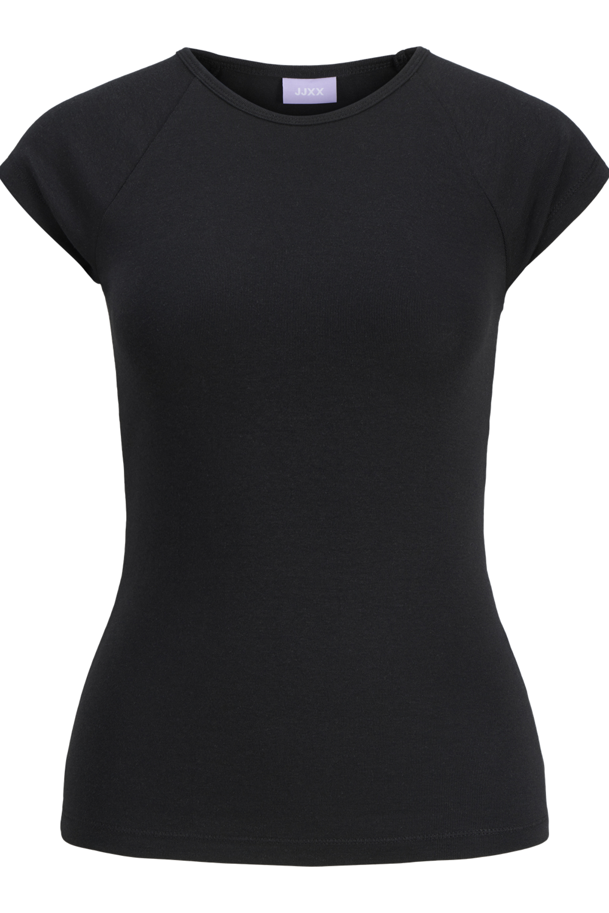 This black raglan t-shirt is a comfortable and stretchy choice for everyday wear. It has a round neck and short sleeves, ensuring a relaxed and stylish fit. The fabric is knitted in a rib, which gives a soft feel and slight stretch, so it fits well and feels comfortable all day long.
