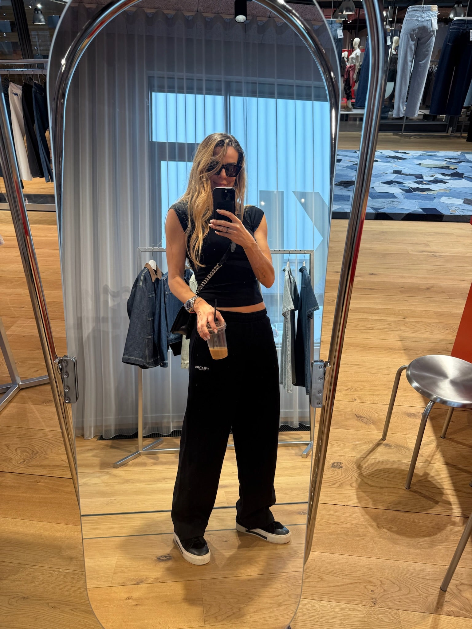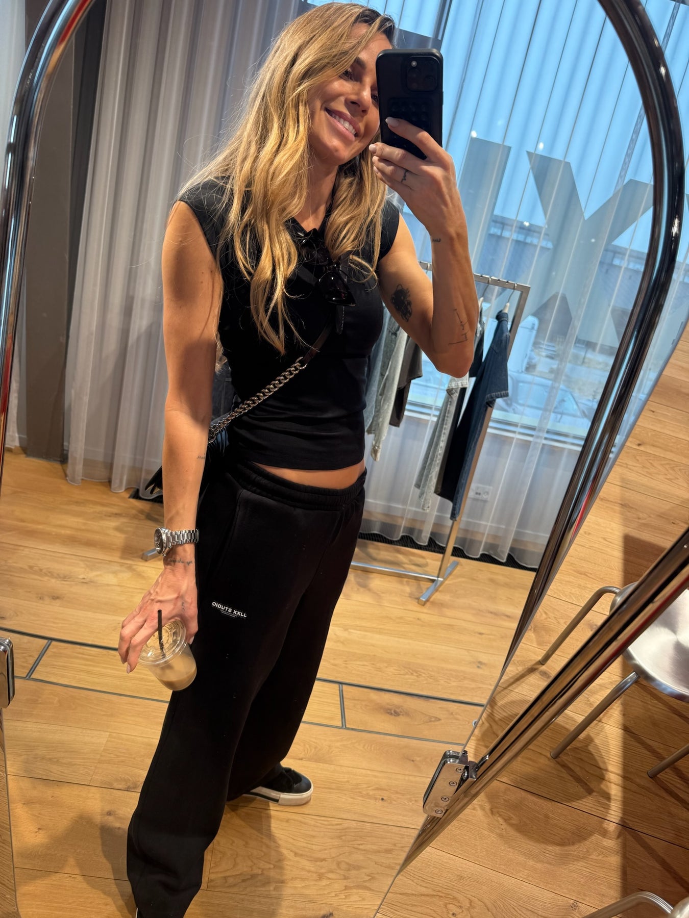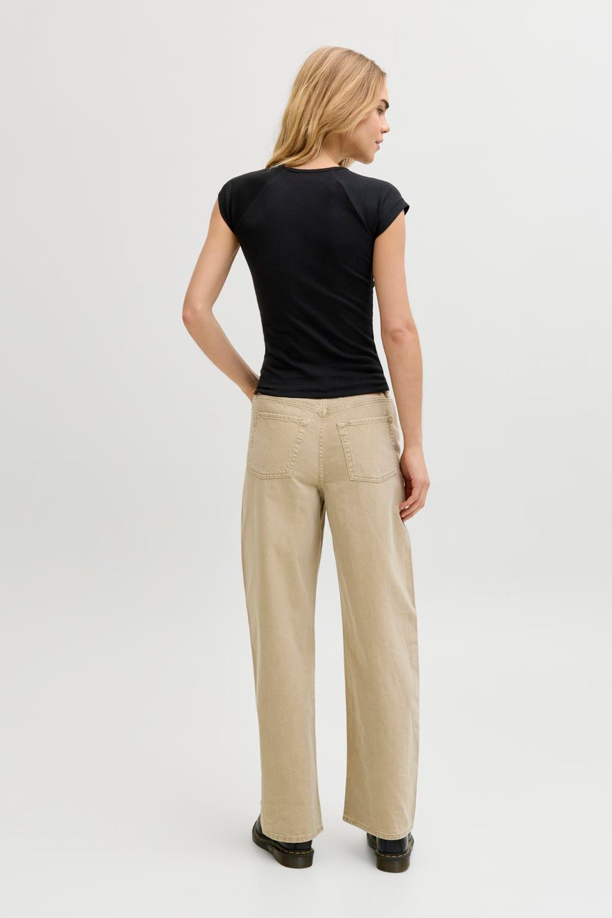 This black raglan t-shirt is a comfortable and stretchy choice for everyday wear. It has a round neck and short sleeves, ensuring a relaxed and stylish fit. The fabric is knitted in a rib, which gives a soft feel and slight stretch, so it fits well and feels comfortable all day long.