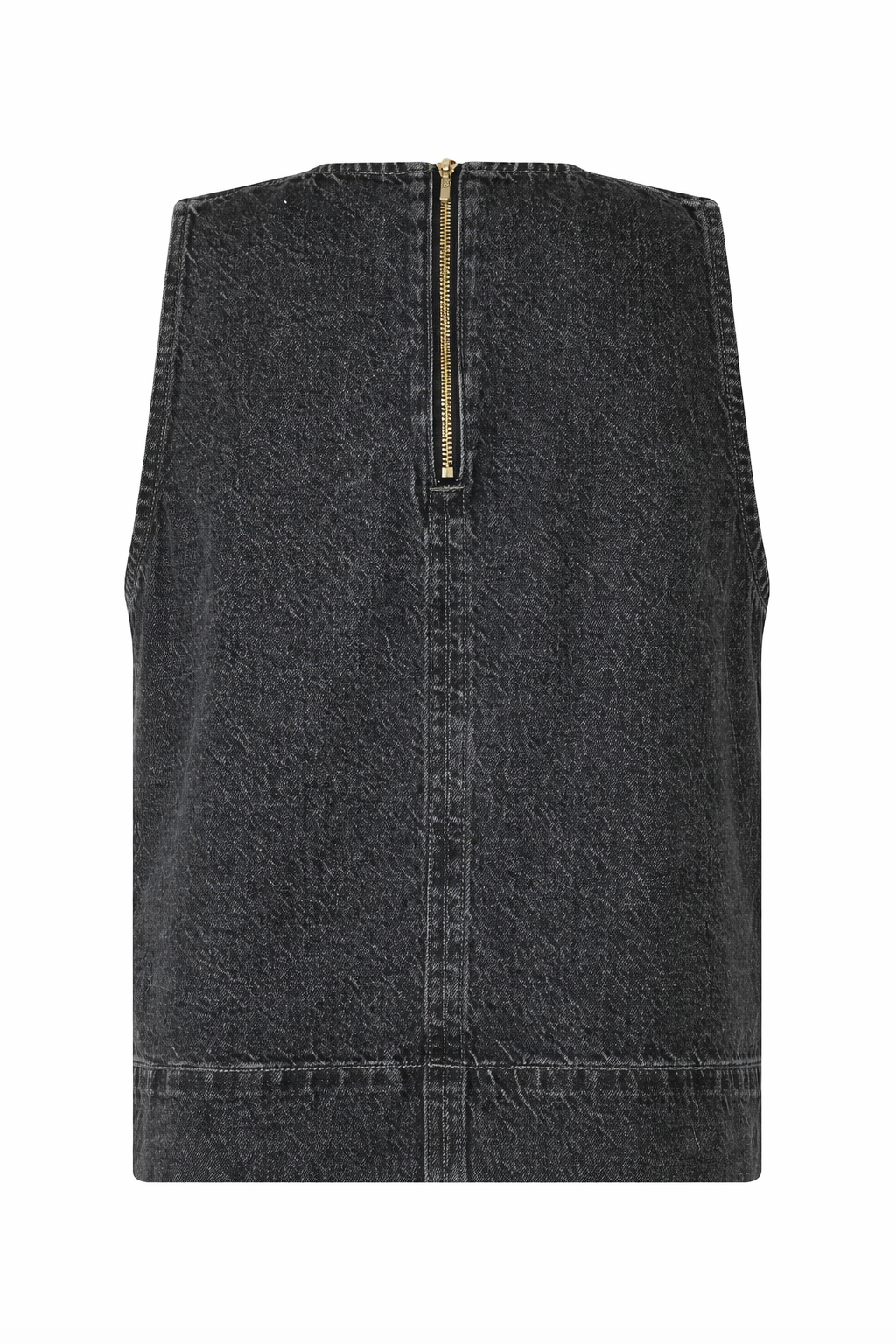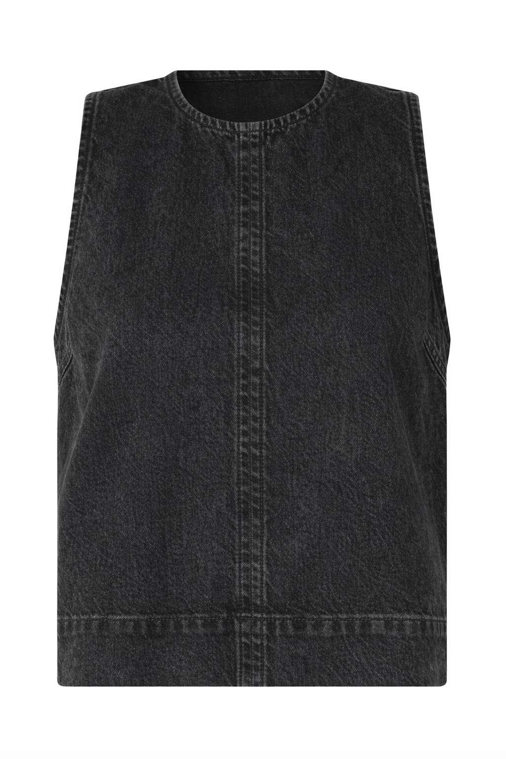 Ærmeløs denimtop fra Mbym i en vasket kvalitet med et råt og moderne udtryk. Modellen har en rund halsudskæring og en let boxy pasform, der giver et minimalistisk og tidløst look. De markante syninger foran samt den vandrette søm ved kanten understreger det strukturerede design.