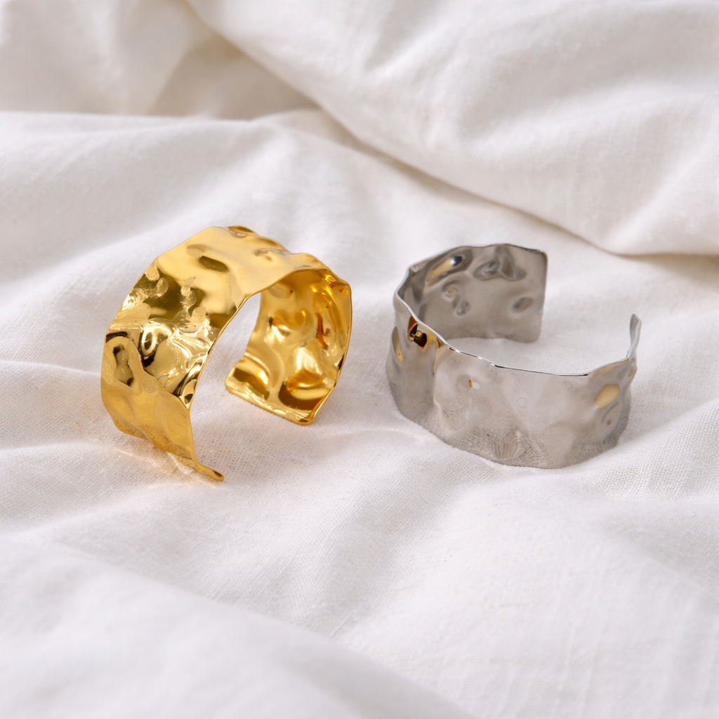 Utah Bracelet fra Nine er et bredt cuff-armbånd med en organisk, hamret overflade og en blank guldfinish, der giver et eksklusivt og moderne udtryk.