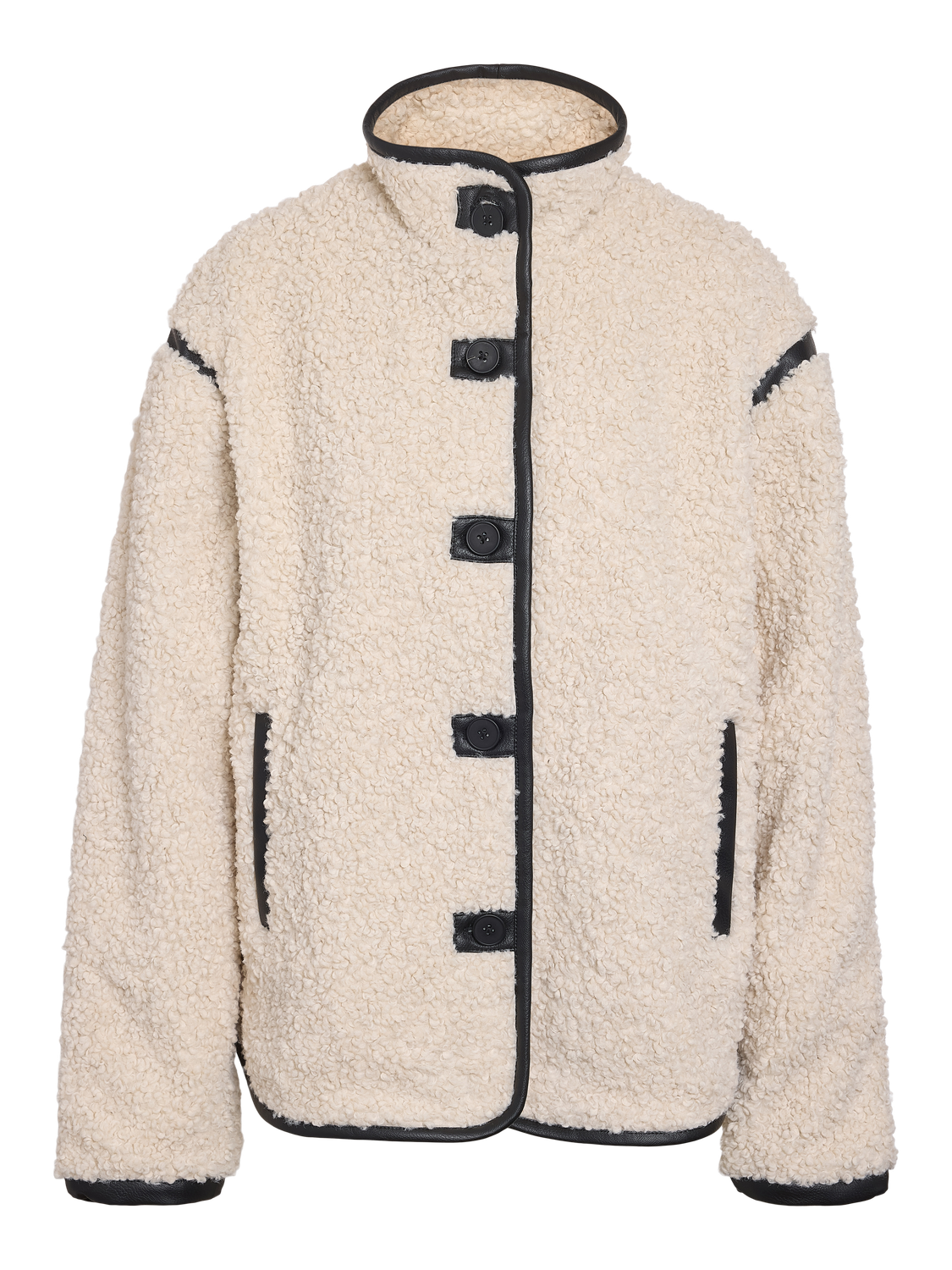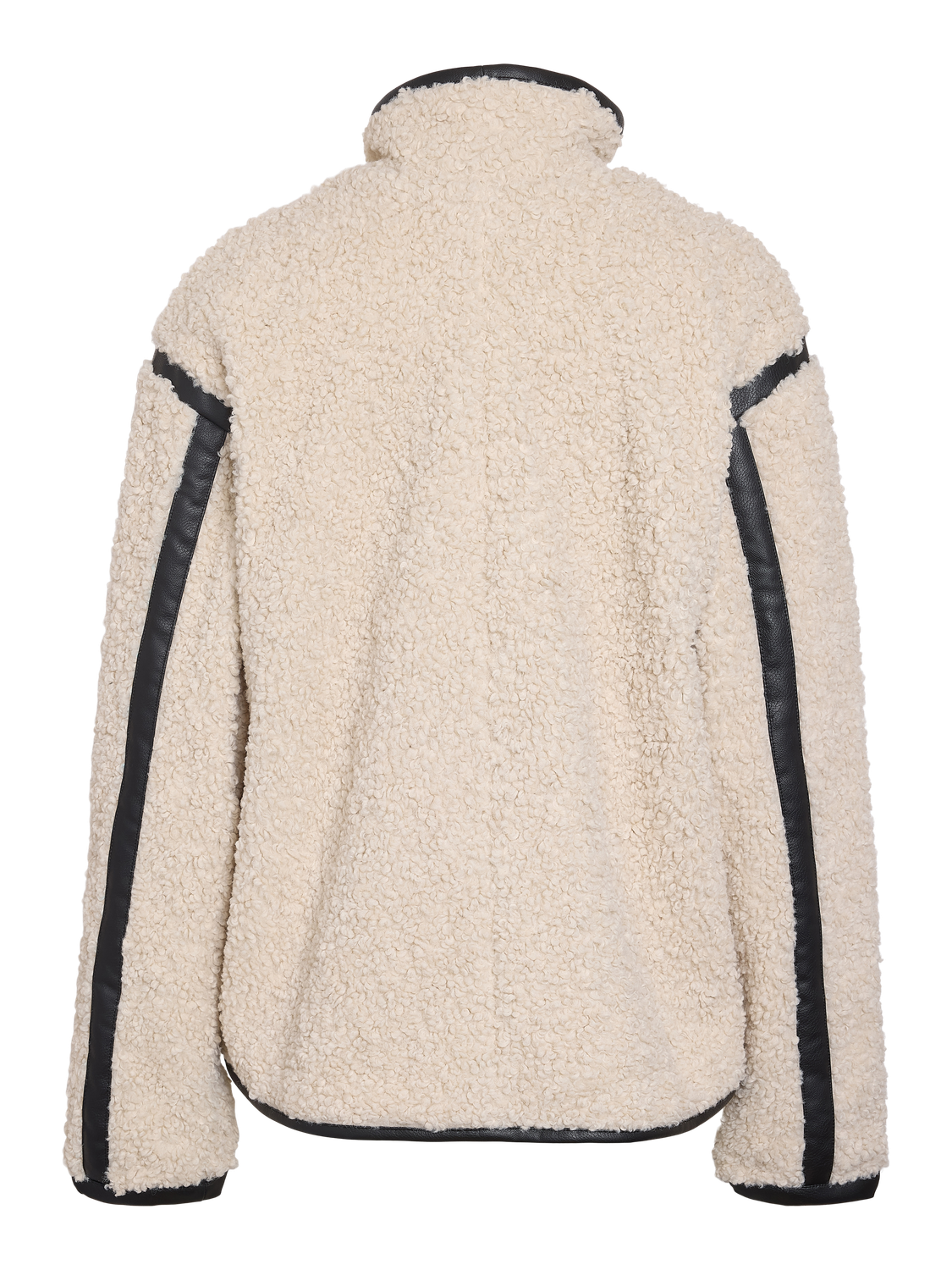The North jacket from Noisy May is a cream-colored teddy jacket with a high neck, long sleeves and a soft, fluffy surface. The dark leather-look edging along the front, neck, sleeves and pockets has a smooth, slightly shiny texture that creates a clear contrast to the teddy material.