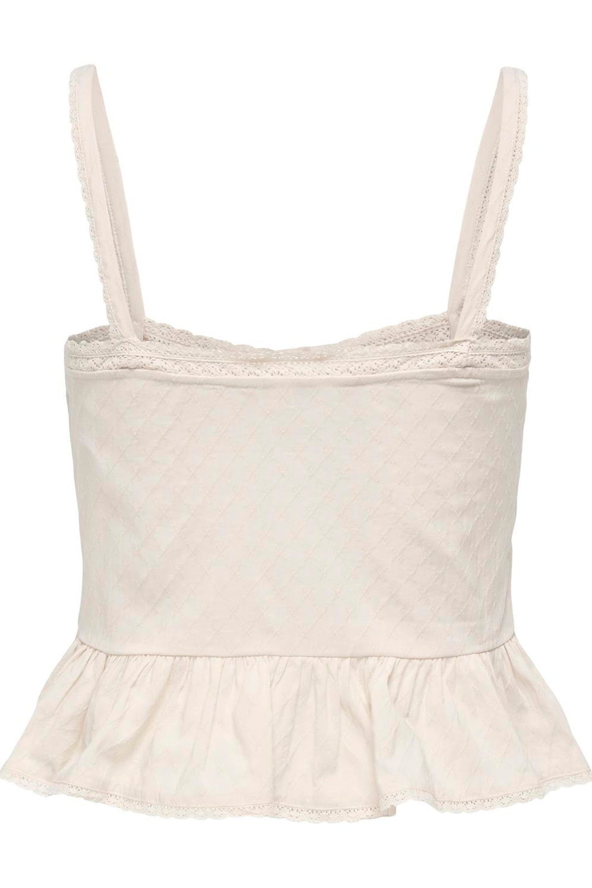 Let vævet top fra Only, i en sart whisper pink nuance med blonde-detalje. Toppen har smalle stropper, v-hals og knaplukning, og den er lavet i en blød blanding af bomuld og viscose, hvilket giver en behagelig, afslappet pasform til hverdagsbrug.
